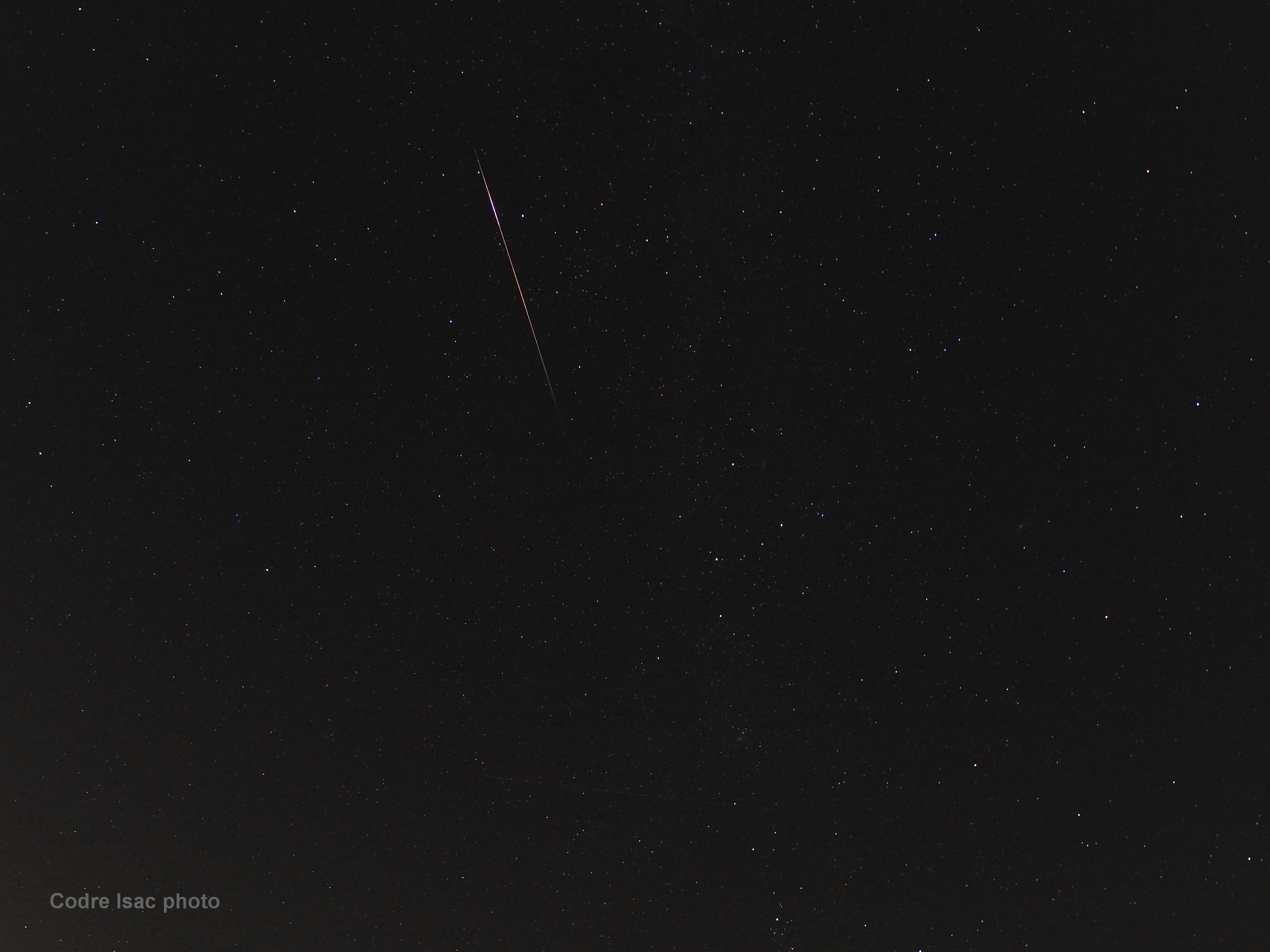 Ieri seara (12 spre 13) am iesit in afara Bucurestiului cu un prieten sa urmarim Perseidele. Atasez mai jos o poza facuta de mine cu un bolid. Acest bolid, care a lasat o urma ce a ramas cateva secunde pe cer, a fost cel mai luminos vazut de noi in seara aceea. A fost pe la ora 00:50. Mai fusese unul in jur de ora 22:00, dar ala a fost doar aproape la fel de puternic, si pe care doar l-am vazut.