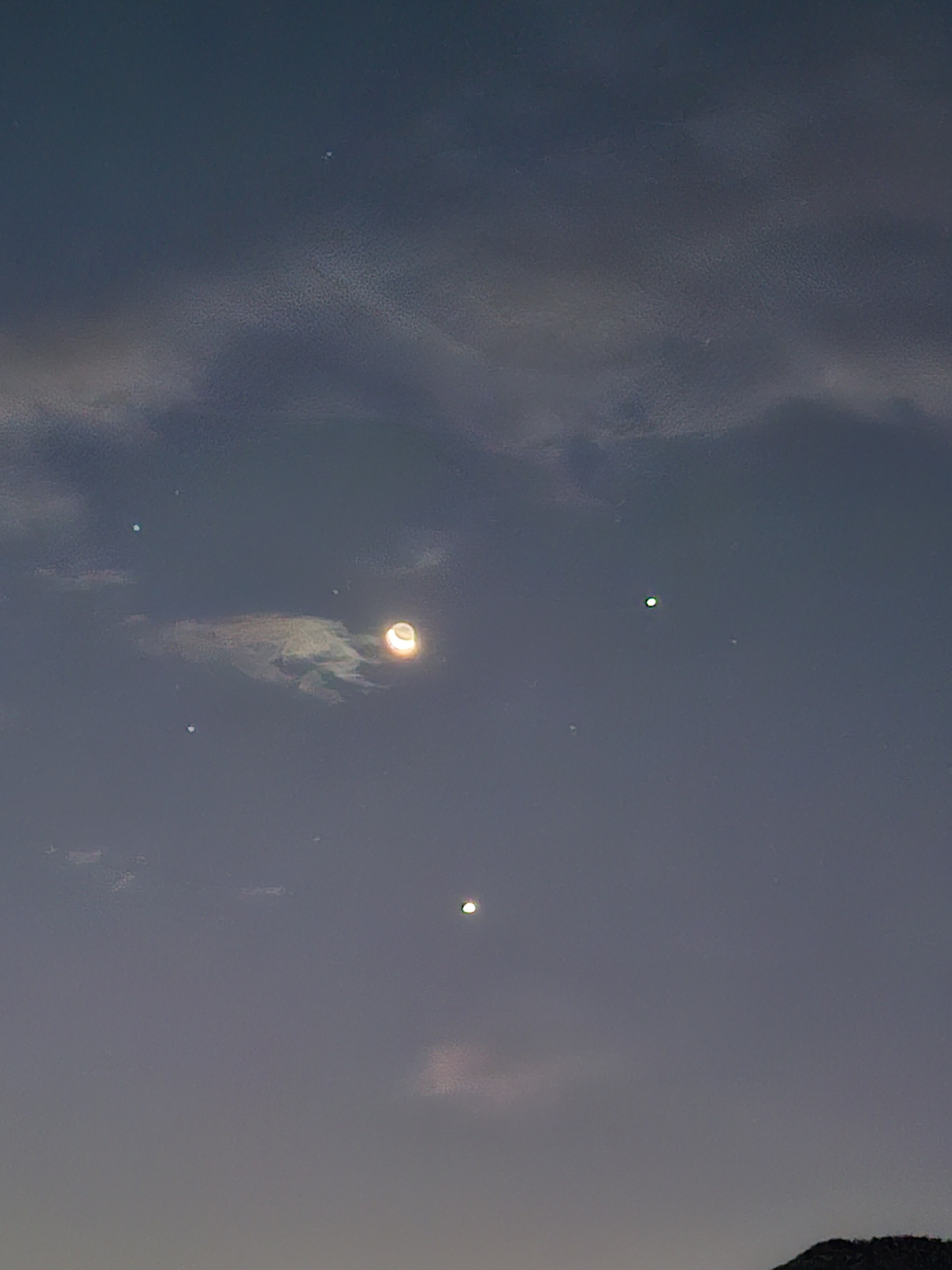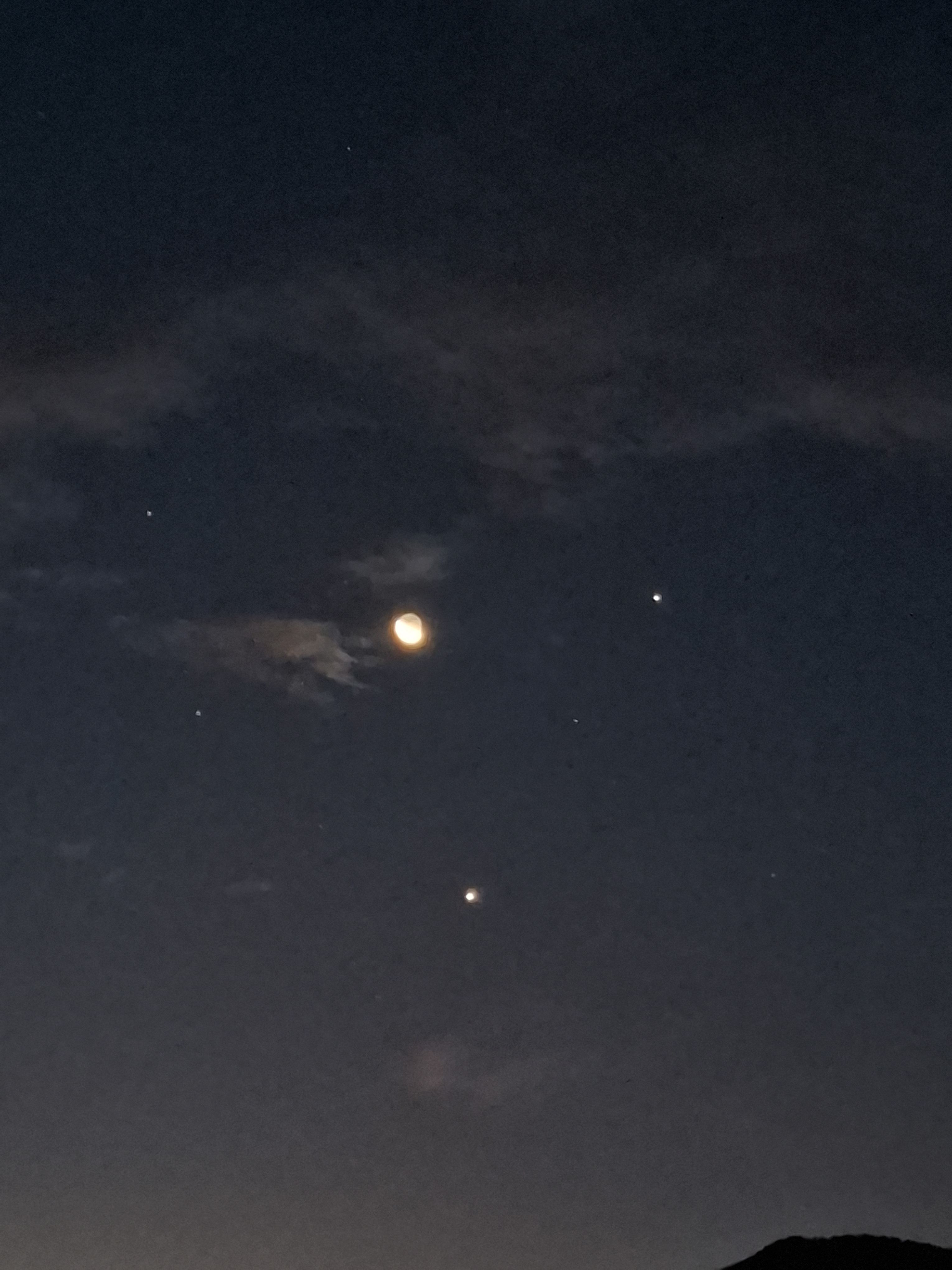 Cu ochii liberi s-a vazut o configuratie foarte frumoasa pe cer, la rasarit, planetele erau luminoase, iar la Luna i s-a vazut slabut si lumina cenusie si ceva "mari" vizibile spre nord. Deja la aceasta ora erau pe cer frumos prezente si constelatiile, stelele de iarna, Orion, Hyadele, Pleiadele etc. Am luat si binoclul si m-am bucurat de tot ce mi-a oferit cerul, Luna cu lumina cenusie s-a vazut excelent, "3D", cu stele in fundal, am mai observat Jupiter cu satelitii sai, Venus ca o secera luminoasa, Closca cu pui, M42, Taurul / Hyade, toate foarte frumoase!