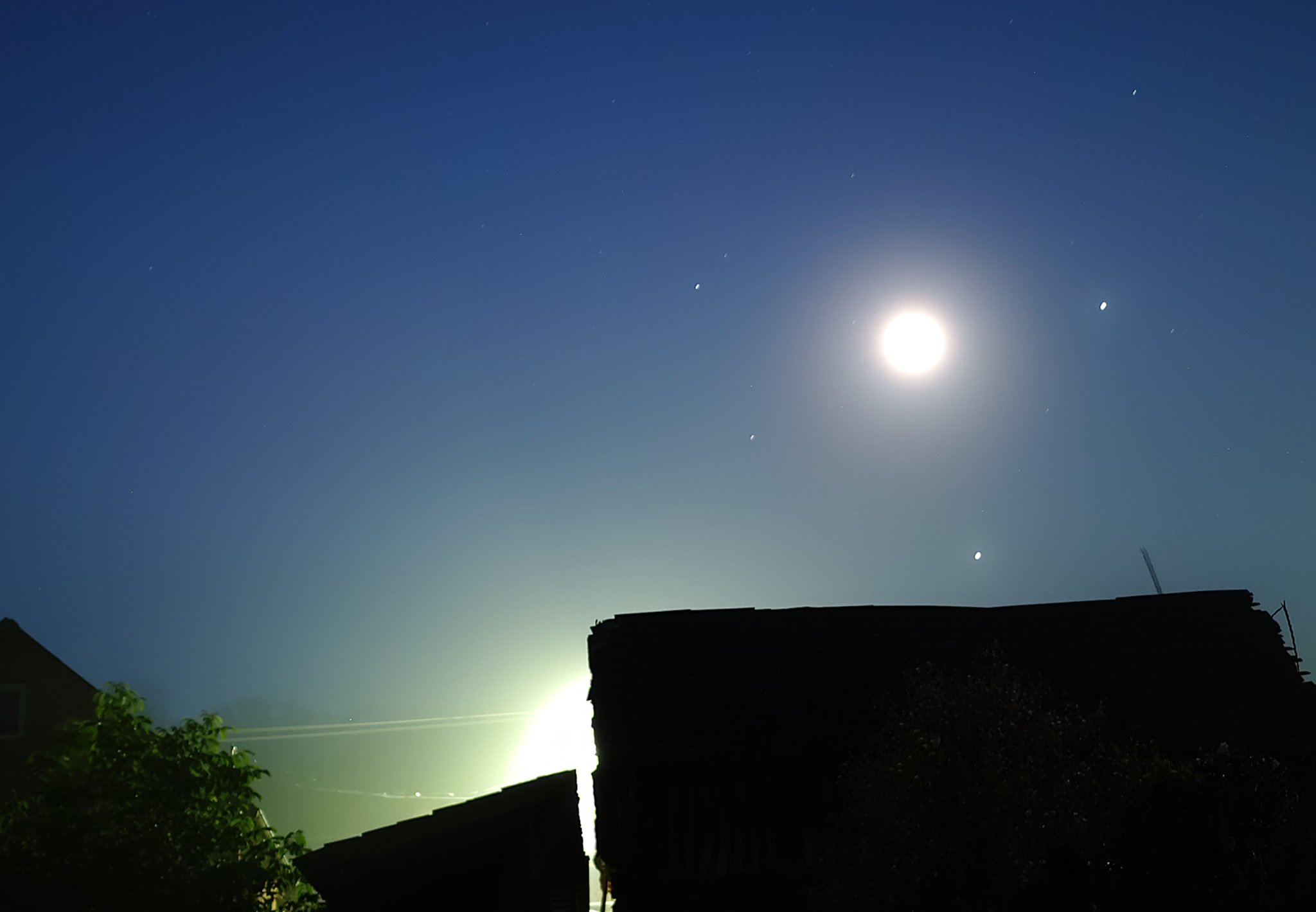 Azi noapte, in jurul orei 22-23, Calea Lactee se vedea foarte frumos conturat cu ochii liberi (asemanator cu imaginea camerei Tapo c325wb, poza mai jos). Dar nu am iesit la observatii cu telescopul, ci m-am culcat ca sa ma pot trezi devreme, la 5 dimineata, pentru observarea minunatei conjunctii cu ochii liberi! Azi dimineata a avut loc conjunctia dintre Luna (10.9% iluminata), Jupiter, Venus, Pollux & Castor! Daca nu era ceata, se vedea si Mercur in conjunctie cu roiul M44 "Stupul"!