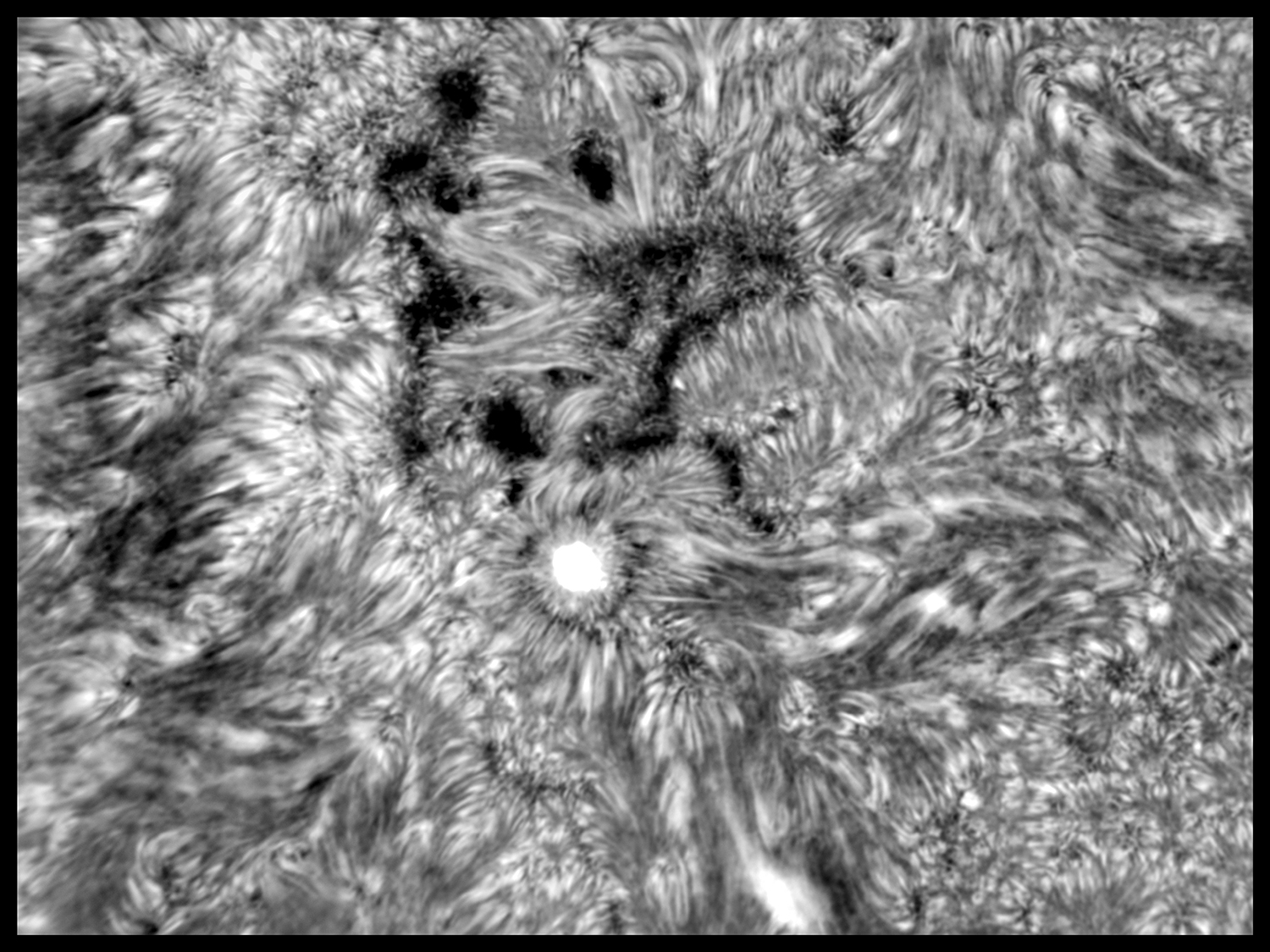 Prezint cateva imagini cu Soarele de astazi in H-alpha, scanat cu spectroheliograful de 60mm, atat in bin1 cat si in bin2. Primele doua imagini sunt in mod bin1 ,mai mari si cu rezolutie mai mare, iar celelalte doua sunt in mod bin2 dar obtinute din scaderea cu imagini in banda de continuum din preajma liniei H-alpha, extrase din aceeasi scanare.