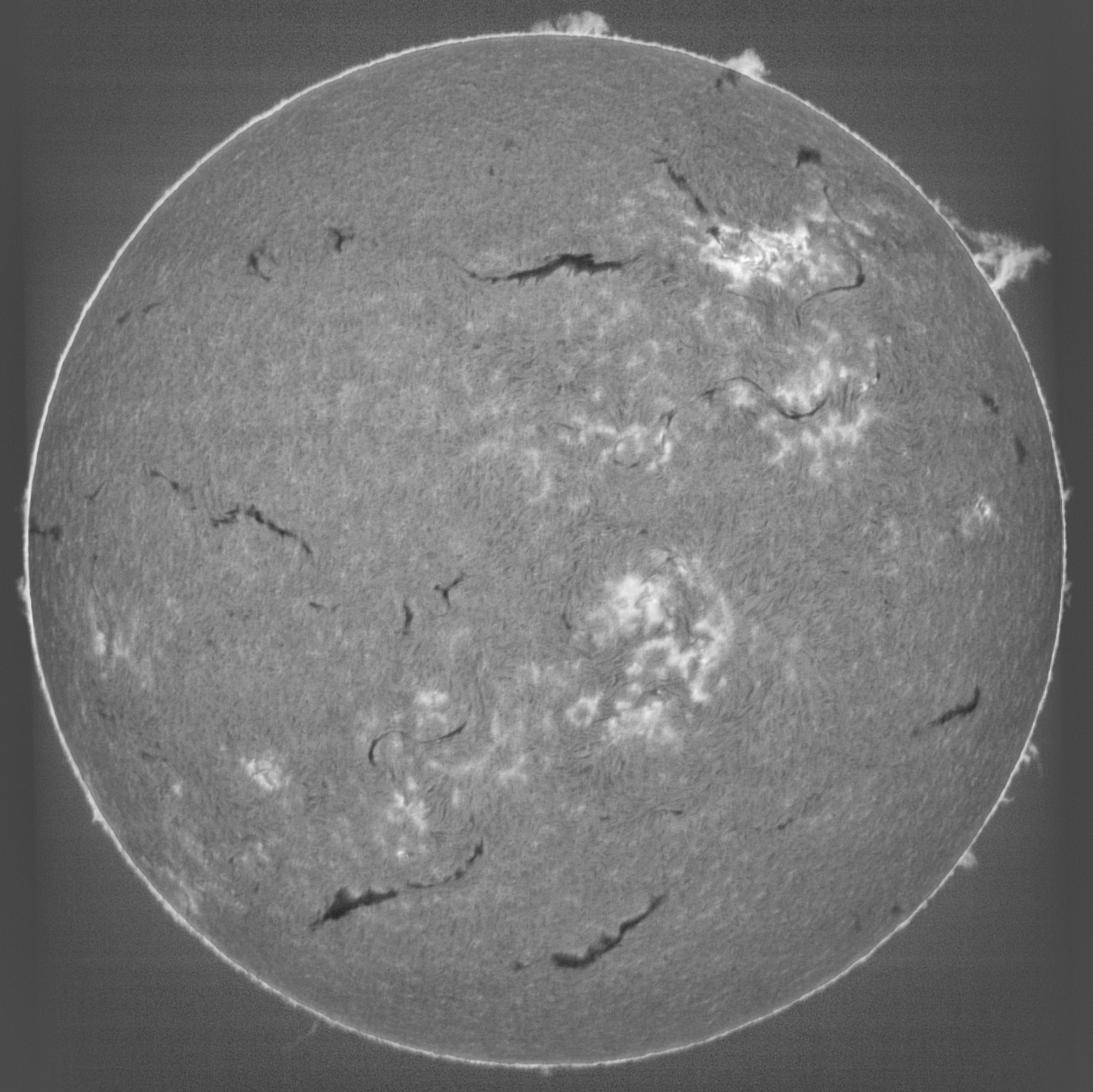 Soarele astazi in H-alpha, prin nori Cirrus si atmosfera incarcata de praf saharian. Spectroheliograf de 60mm + camera ASI178MM, pe montura ecuatoriala.