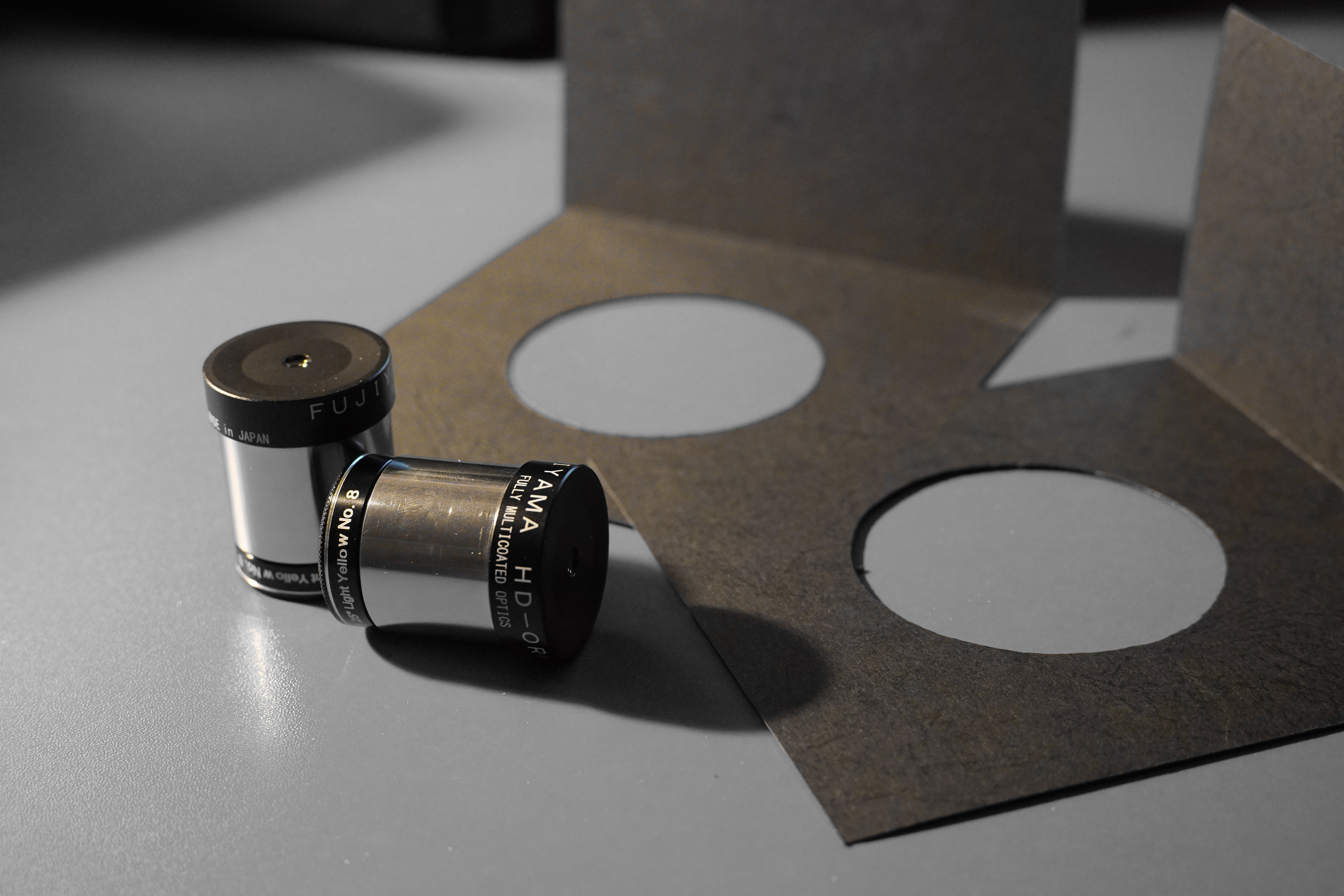 Masca pentru diafragmare am facut-o din carton pentru probe, urmand sa decupez o gaura chiar in capacele de plastic ale binoclului. Iar filtrele galbene sunt Light Yellow no.8 de la Explore Scientific.