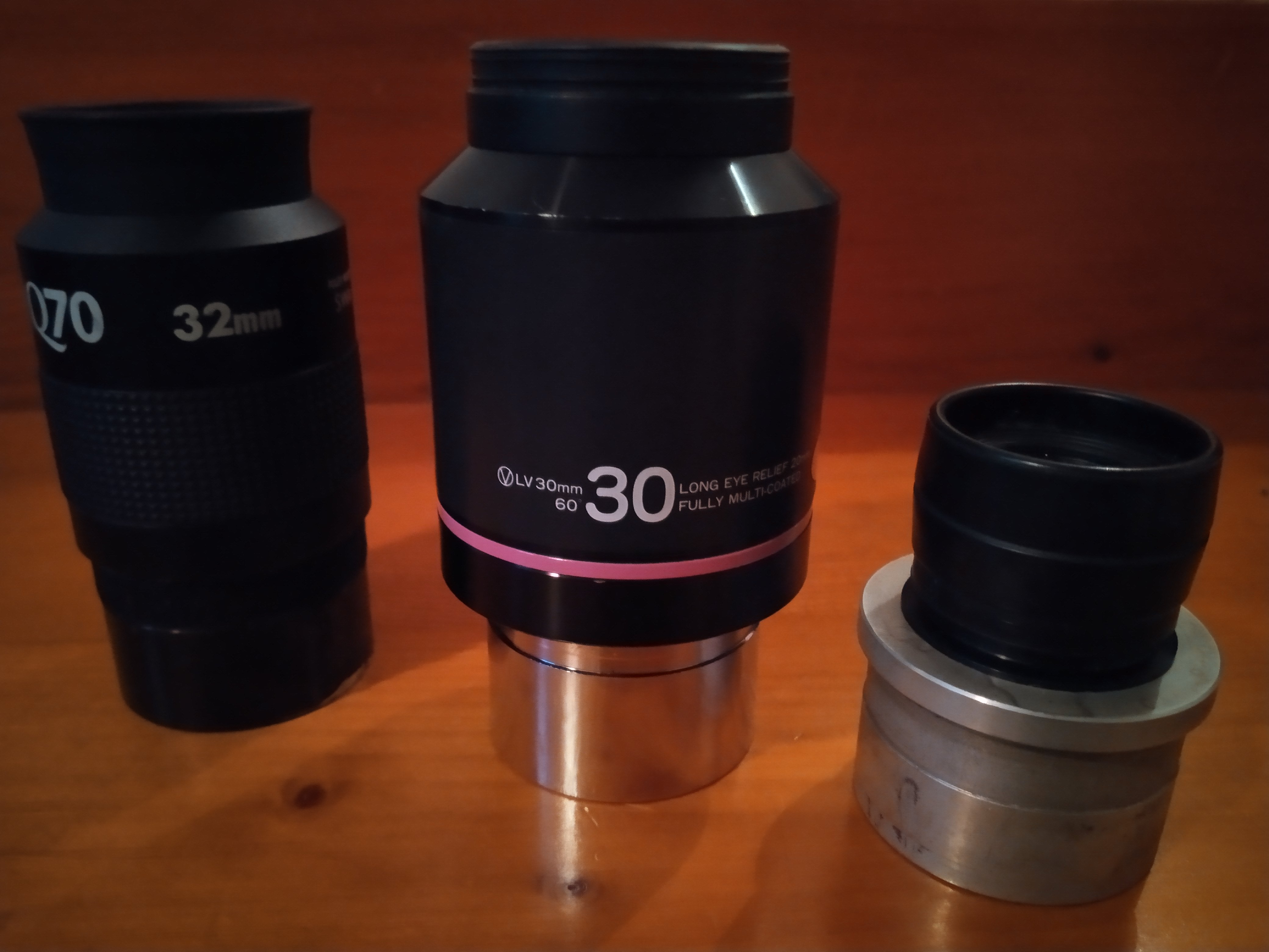 Pe rândul din față sunt Erfle de binoclu cu adaptor de 2" (cel de 1.25" vigneta), plossl de 40mm improvizat, urmează să-i fac montură la strung, un kelner ieftin de 25mm pe care vreau să-l pun la telefon ca obiectiv pentru macrofoto, un alt kelner de binoclu vechi foarte bun pe care l-am adaptat pe 1.25", un orthoscopic excelent provenit de la un instrument optic pentru reglarea dioptriilor la binocluri și ultimul din serie este tot un ortho 8X cu reticol de măsurare pentru microscop, pe barrel 30mm. Mai am un ortho de 18mm pe barrel de 0.965" de care am uitat, încă nu am adaptor la el.