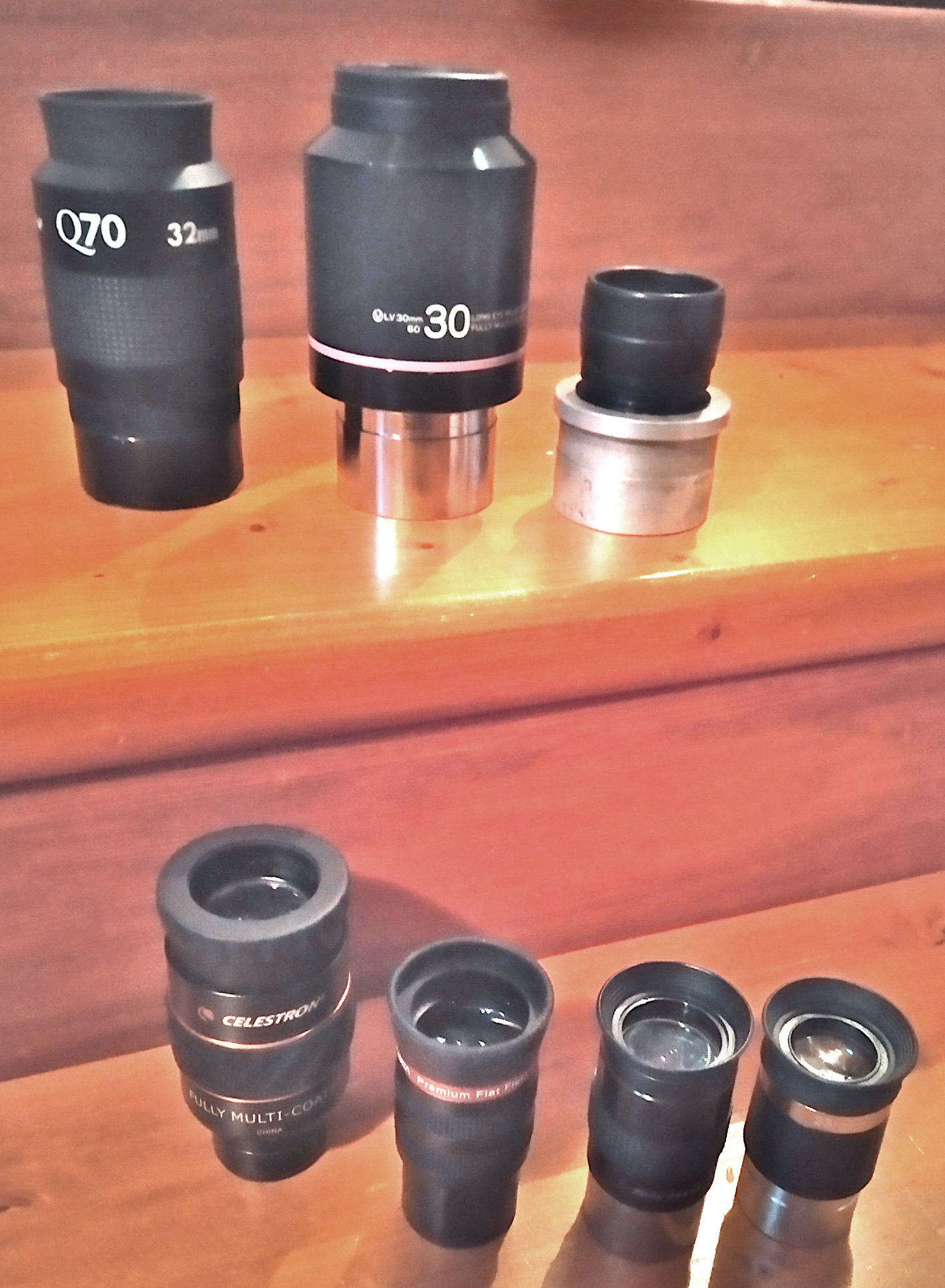 Pe rândul din spate sunt Hyperion 8mm, TV Panoptic 24mm, Nagler Type 6 11mm, Meade Kelner 40mm (primul meu ocular cumpărat), Kelner 12mm, Fulerscope Ortho 12.5mm și un ocular special: Solid Plossl 12.3mm by Zoth.