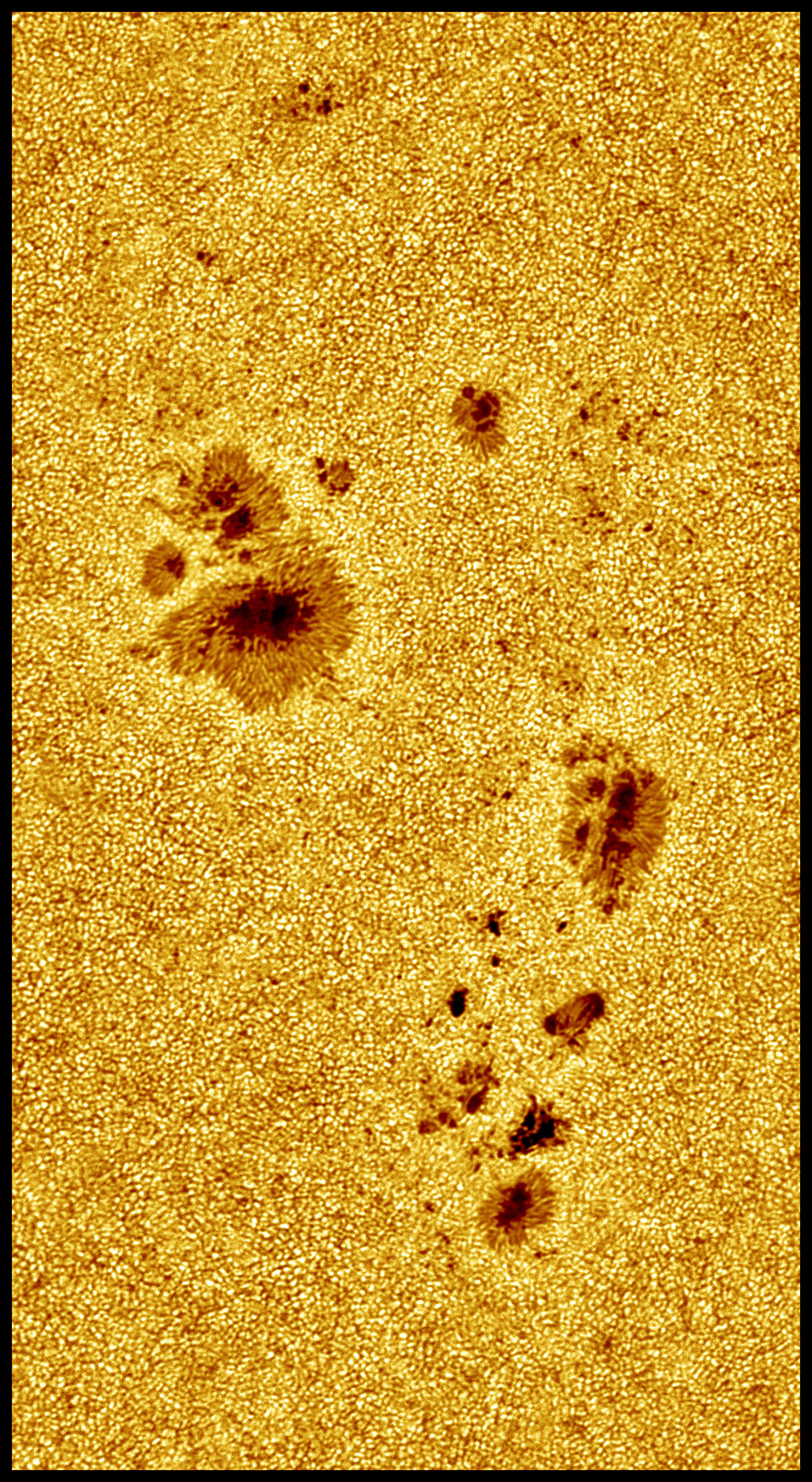 Mai jos prezint o imagine-mozaic cu discul intreg, realizata din 4 imagini rezultate din 4 stive a cate 500 cadre facute la focala nativa de 900mm a telescopului, si o imagine close-up cu regiunea AR4274 cu pata solara gigantica, facuta dintr-o stiva de 10000 cadre, la focala de 1800mm cu barlow 2x.