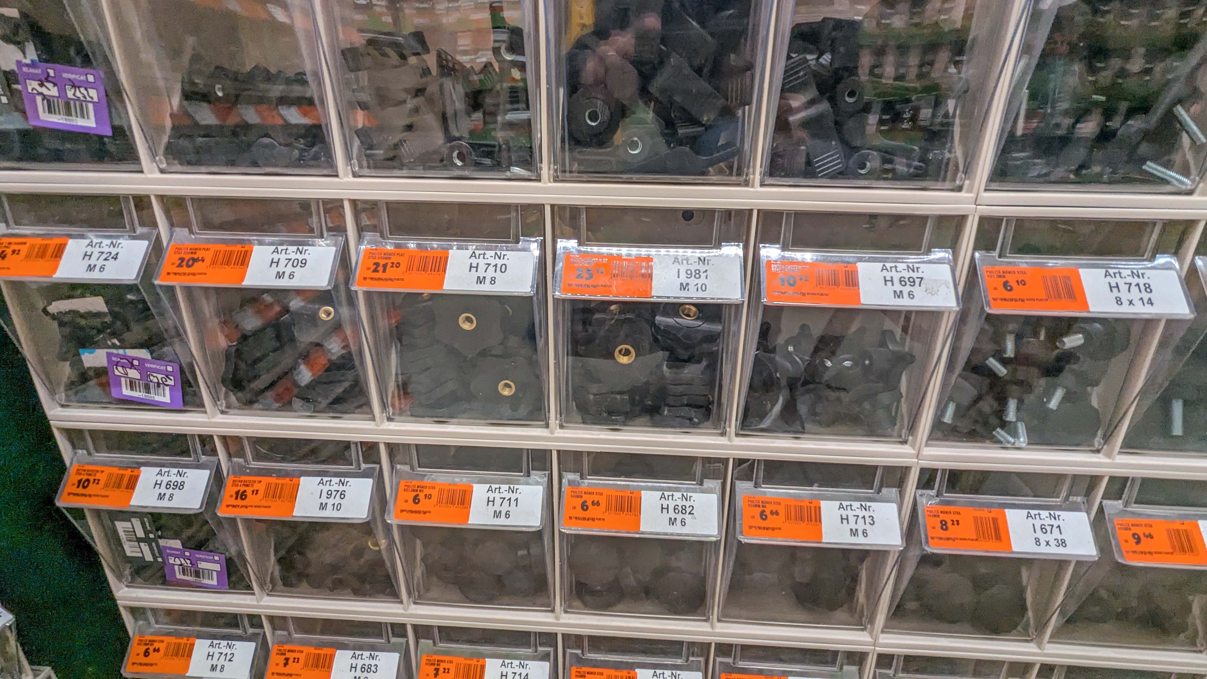 De prin periplurile zilnice, atrag atentia nu asupra suruburilor metrice sau imperiale, ci asupra raionului cu rozete, manete, arcuri si inserturi filetate diverse tipuri si modele. Sunt vreo cativa mp de sertare la hornbach: