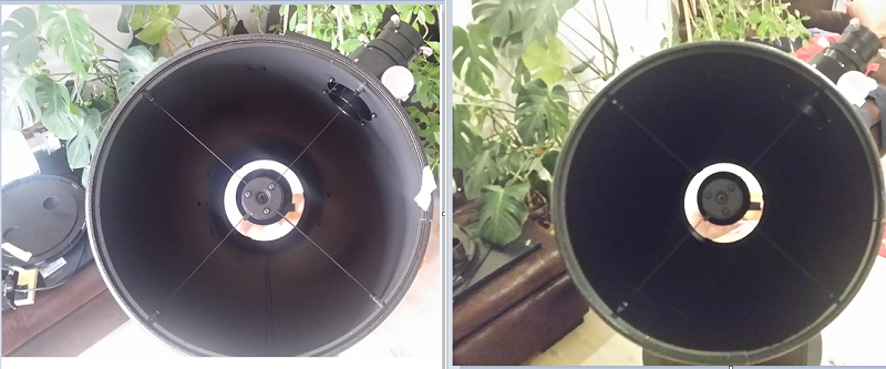 1_ Mărirea distanței între primară și secundară ca să apropii ocularul de secundară: Sky-watcher a calculat reflectoarele în așa fel încât ai nevoie de o extensie de 35mm a tubului portocular și a pus în pachet una de 50mm. În timp ce mă scărpinam în cap cum să mut oglinda principală cu 35mm mai jos mi-a picat în mână un corector de comă HR de la Explore Scientific. Montat pe focuser fără extensii aduce ocularele în planul focal cu tubul culisant la ras cu interiorul tubului optic. Și, pentru că primul grup de lentile din CC e pozitiv, câmpul de plină lumină a crescut întrucâtva.