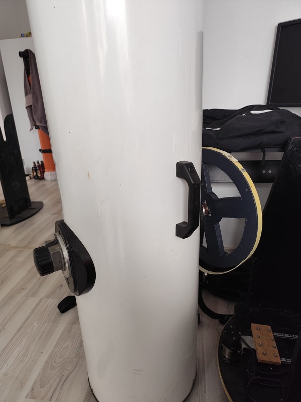 4_ Echilibrarea: Cu corectorul de comă și ocularele preferate telescopul trage în jos. Am adăugat bucăți de oțel pe un magnet puternic până la cca 1.5kg apoi le-am învelit în bandă adezivă(duct tape). Contragreutatea o atașez în partea de jos a tubului PE BURTĂ, nu pe spate; o mut în sus și în jos ca să echilibrez telescopul în poziție orizontală și lateral pe tub ca să-l echilibrez în poziție verticală.