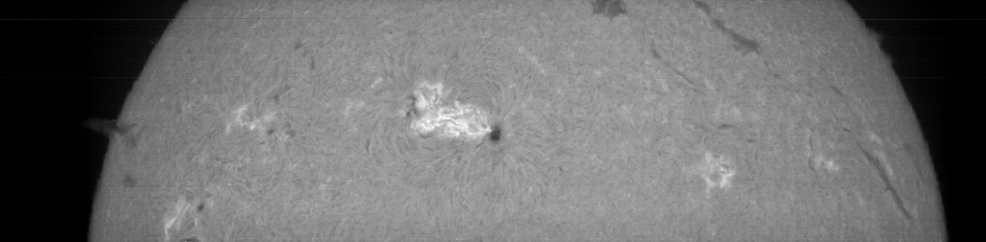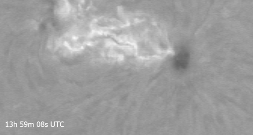 Imaginea extrasa in scanarea de la ora 14:14 UTC aparea intunecoasa si in partea de sus doua zone luminoase, ca niste pete difuze eliptice care era punctele cele mai fierbinti ale eruptiei solare (softul SHG v. 4.3 cu care extrag din scanari imagini ajusteaza automat luminozitatea imaginii ca sa nu apara arse cele mai luminoase zone de pe discul solar), iar in jurul acelor pete luminoase se zarea regiunea AR 4366 pe un fond intunecat.