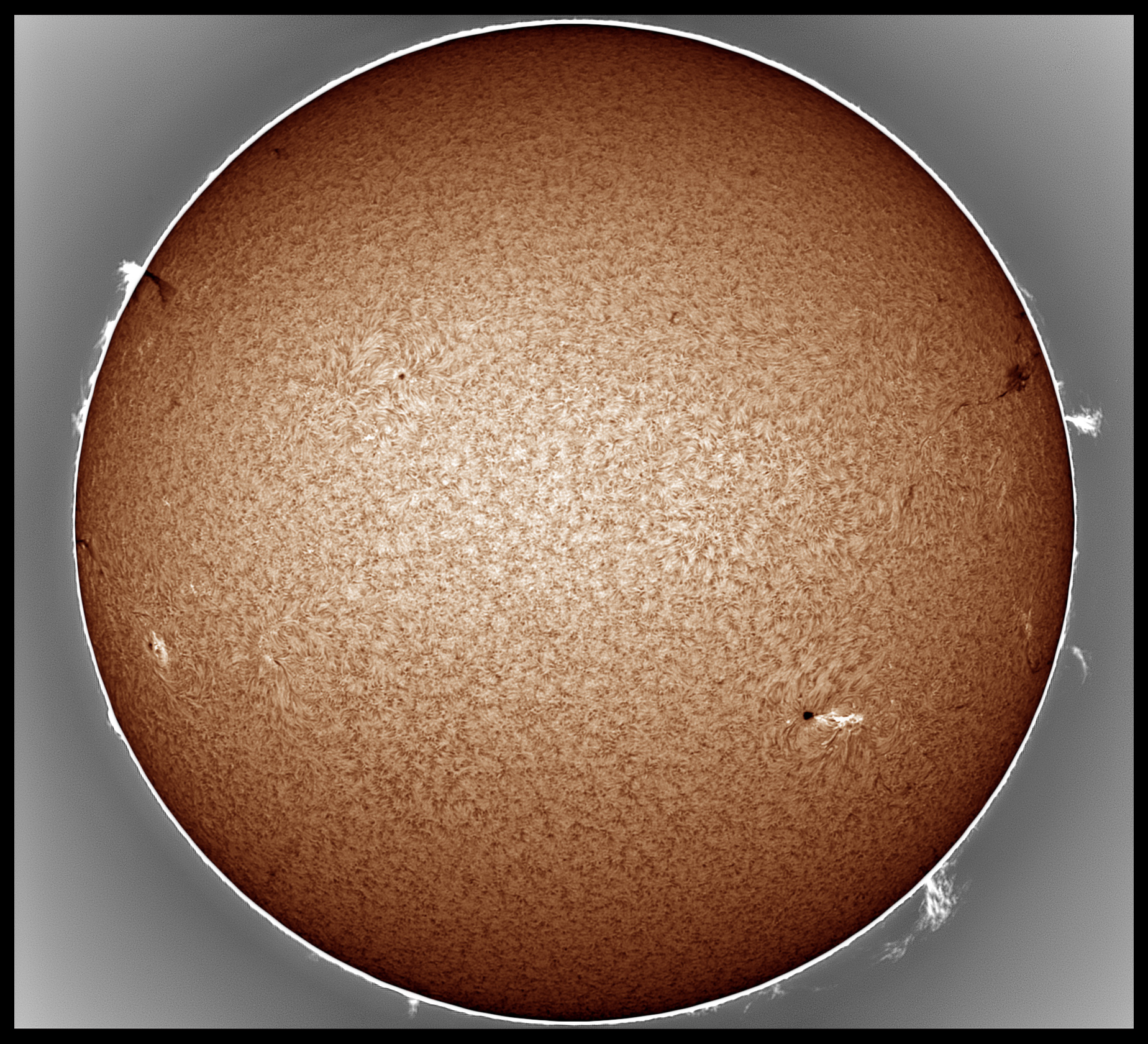 Prezint noi imagini cu Soarele de astazi in H-alpha, scanat cu SHG80mm pe la pranz, inainte sa se strice vremea. Pe discul solar, regiunea AR 4419 din emisfera nordica se dezvolta vertiginos, avand o pata solara uriasa si un grup de pete mai mici si pori, ce au o polaritate magnetica opusa fata de pata solara mare, iar in stanga petei mari se afla o zona luminoasa activa vizibila in H-alpha, suprapusa peste grupul de pete mici si pori ale regiunii AR 4419. Cealalta regiune din emisfera sudica, anume AR 4415, cu o singura pata solara de forma circulara, a ramas stabila de cand a aparut pe fata vizibila a discului solar. Pe limb, aspectul protuberantelor s-a mai schimbat, unele au disparut, altele au aparut in alte locuri de pe limb.