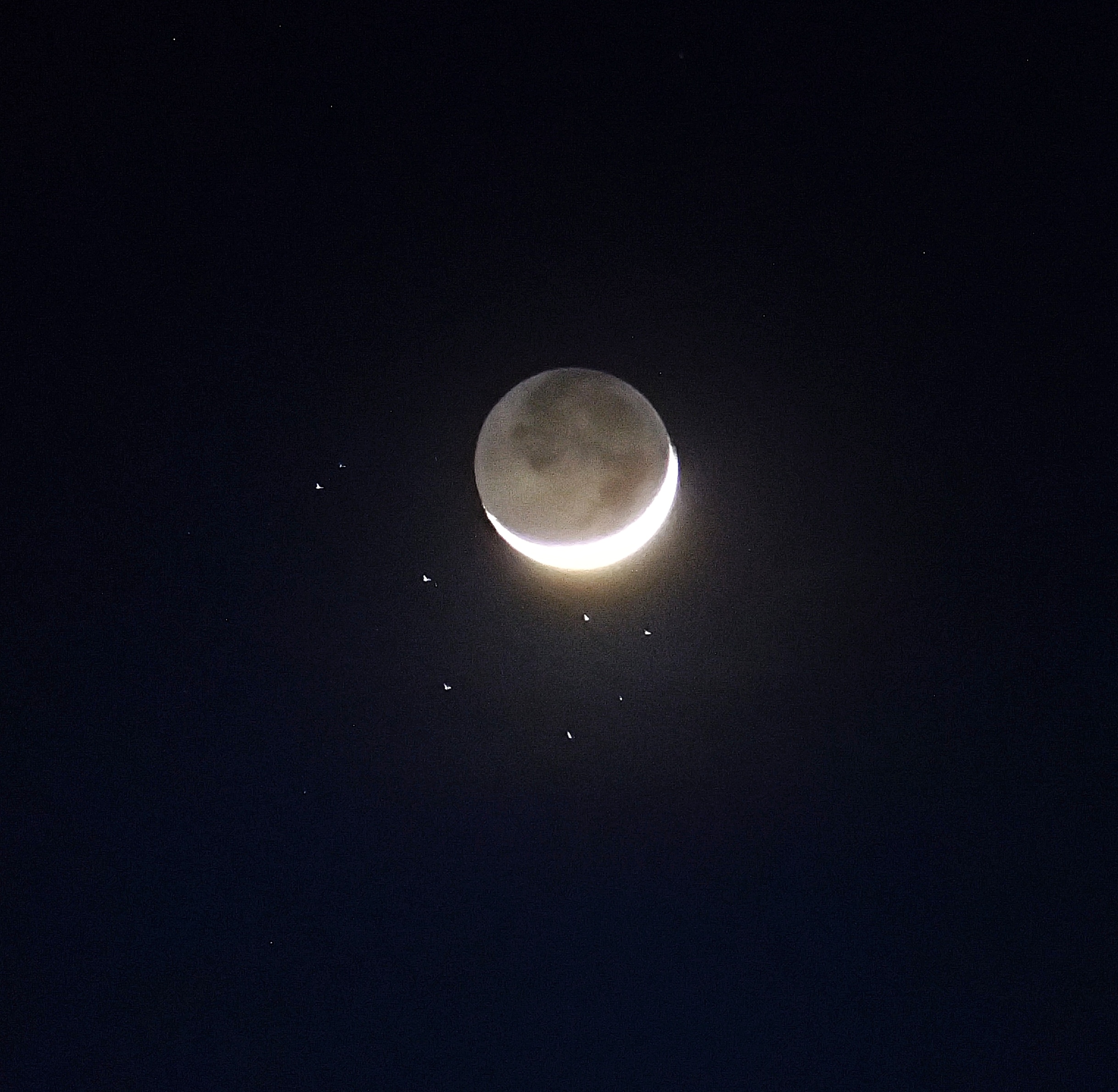 În seara asta, 19.04.2026, ora ~21:20 am reușit să observ o ocultație frumoasă între Lună și Pleiade (M45) sau Cloșca cu Pui popular. Se vedea clar și detaliat și partea cenușie, cea iluminată de Pământ, iar stelele din Pleiade se vedeau clar și frumoase. Am făcut și o poză cu telefonul prin binoclu. Am reușit să observ și planeta Venus sau Luceafărul, care era foarte luminoasă, fiind grea observarea fazei ei (90% iluminată). Sper să mai revin cu rapoarte de observații, încep lyridele curând și iubesc meteorii, mai ales bolizii! Dar începe și perioada cu examene / parțiale.