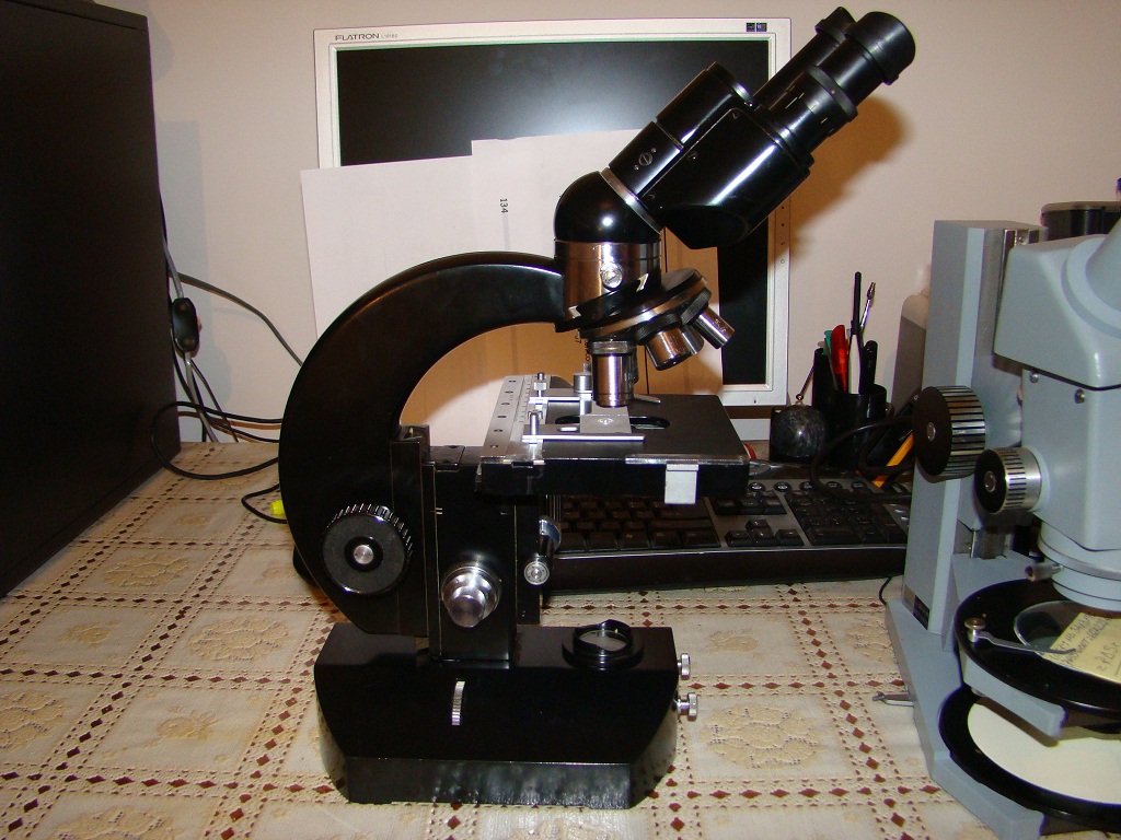 Microscop de laborator Oculare 10x, obiective acromate 6x; 10x; 20x; 40x; iu90x;cCondensor pt. camp iluminat cu deschinerea A=1.4, miscare rapida cca 1.7-40mm miscare fina 0.02mm, iluminare naturala si artificiala cu bec 6V/15W