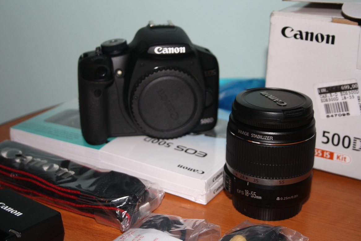 1. Canon D500 + obiectiv 18-55 IS in cutie sigilata cu toate accesoriile: incarcator, baterie, CD, curea.
