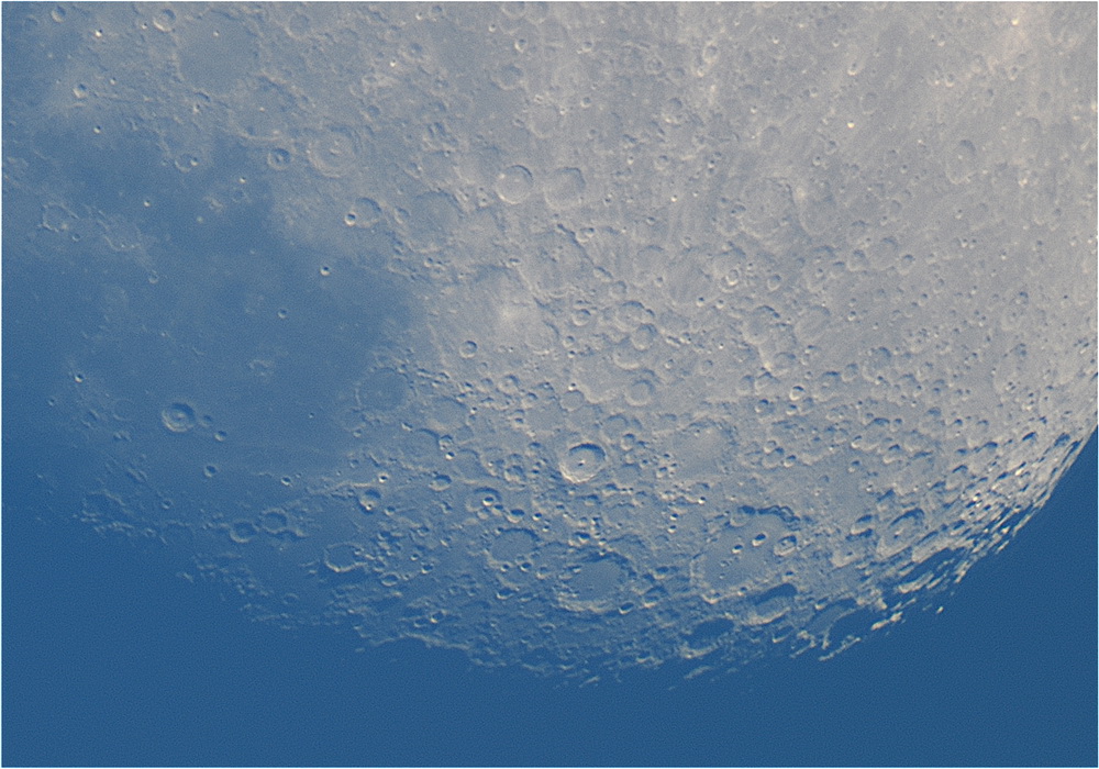 Am reusit sa observ vizual doar putin timp luna, cu oc. Vixen LV 30mm la 70x in crepuscul. Se vede foarte bine definita, clara si cu un contrast ridicat. Aberatia cromatica este minima, nu deranjeaza deloc observatiei.