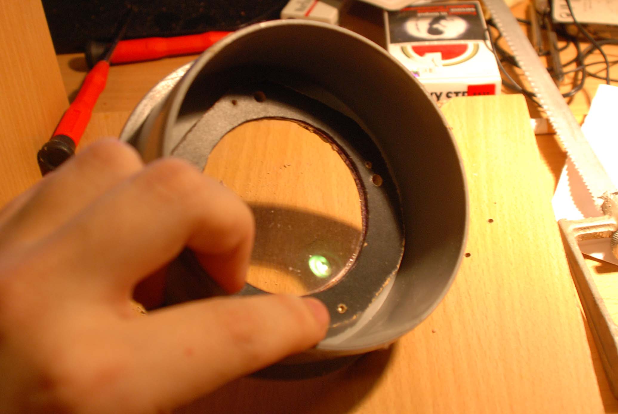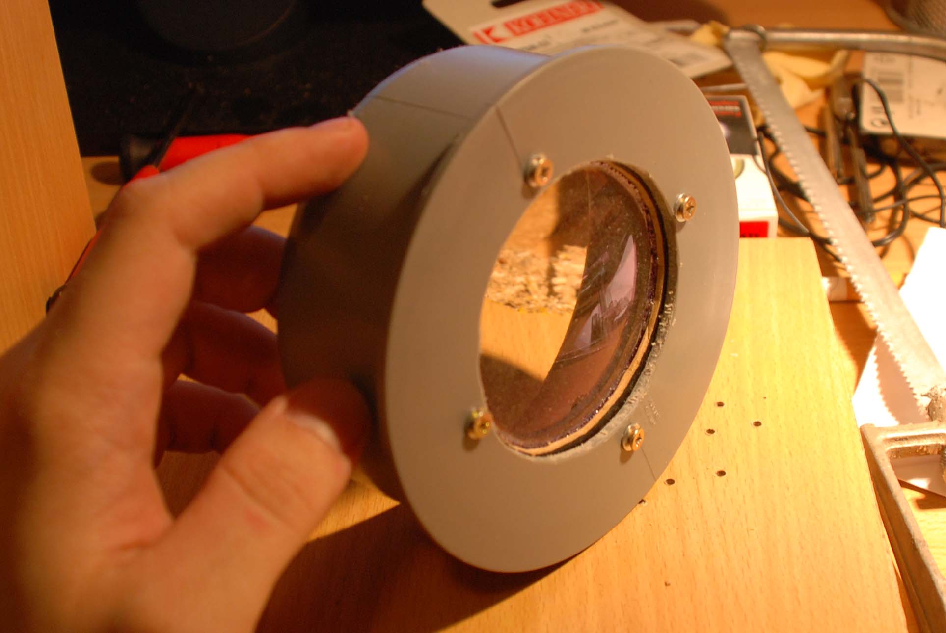 Folosind un tub de pvc, un capac pentru acesta, pe care l-am decupat si placaj am realizat prima parte a tubului lunetei.