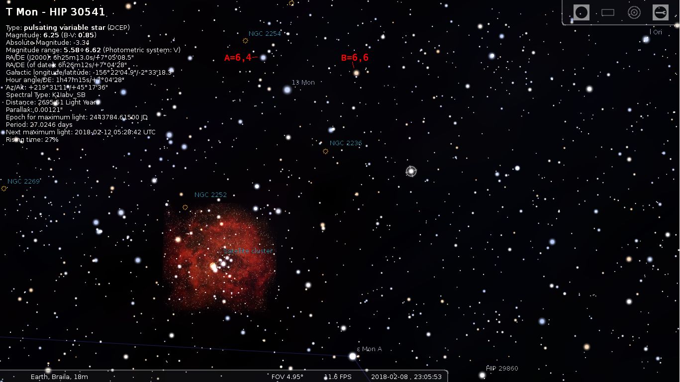 In primul rând, steaua Algol (Beta Per) are un minim pe data de 10 februarie, la ora 21:20, ora României, apoi steaua AR Aur,din constelatia Auriga, tot binară cu eclipsa, ca și Algol, are un minim pe data de 28 februarie, la ora 20:13. Ar mai fi și steaua W Gem , care este cefeida,ca și Delta Cephei, va trece prin minim pe 11 februarie, dar la ora 12:40, adică ziua, apoi va trece prin maxim pe 13 februarie la ora 21:38, adică seara,deci va putea fi observată. O altă stea ar mai fi T Mon din apropiere de nebuloasa Rosseta, tot cefeidă, care va trece prin maxim pe 12 februarie, la o oră cam nasoala, 7: 28 dimineață, dar va trece prin minim pe 3 martie, noaptea, la ora 0:57 . O să mai caut efemeride la alte stele și o să mai scriu aici , dacă mai găsesc ceva interesant.