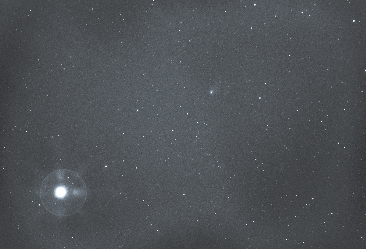 Acu' jumate de oră am scos animalul ( binoclul de 80 mm) la produs și am dat peste ea foarte repede , înghesuită (probabil doar nucleul ) între două steluțe palide , pe direcția dintre Marte și una din stelele ce formează poligonul principal din Auriga .