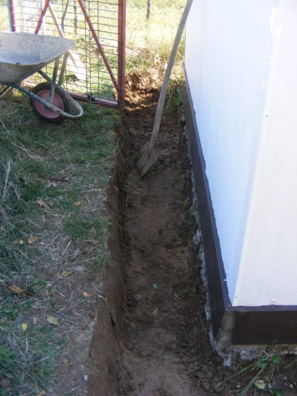 Trebuia facut un sant de drenare care sa dirijeze apa catre o zona exterioara. Asta am facut azi. Am muncit de mi-au sarit capacele. Solutia pe care am imaginat-o a fost saparea unui sant pe doua din laturile observatorului (pe una din laturi am dat o panta inversa, iar in spate am dat panta in continuare catre un teren vecin - o livada), astfel incat apa care se scurge sa nu ajunga sa se scurga prin fata observatorului sau sa balteasca pe langa el.