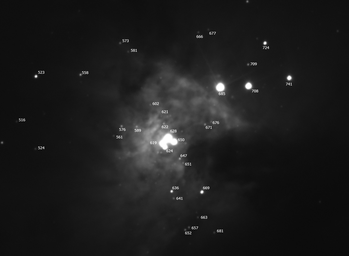 Vizual am reusit sa indentific o mica parte din stelele notate in harta lui Holden si anume 619, 624 ,628 si 640 (notate pe harta lui Holden dar si pe harta intocmita de mine) care sunt defapt stelele din Trapez (am zarit usor si componentele E si F ), 685, 708 si 741 care sunt celelalte trei stele stralucitore de langa Trapez, apoi 724 si cu greu 709, care se afla in apropierea stelelor 741 si 708 (spre S de acestea), stelele 635 si 669 spre N de Trapez, si apropierea lor spre N alte doua stele apropiate intre ele, 652 si 657.