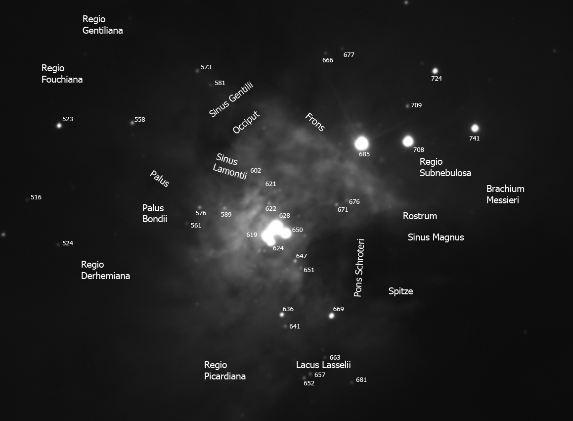 Cele mai evidente formatiuni din zona centrala a M 42 ar fi Sinus Magnus , Pons Schroteri (ce alcatuiesc zona intunecoasa cea mai evidenta de langa Trapezium), Brachium Messieri (filamentul-mustata din partea estica a zonei), Sinus Gentilii , Sinus Lamontii , Occiput (zona intunecoasa din partea de sud a zonei centrale luminoase), Regio subnebulosa (de langa Brachius Messieri), Lacus Lasselii.
