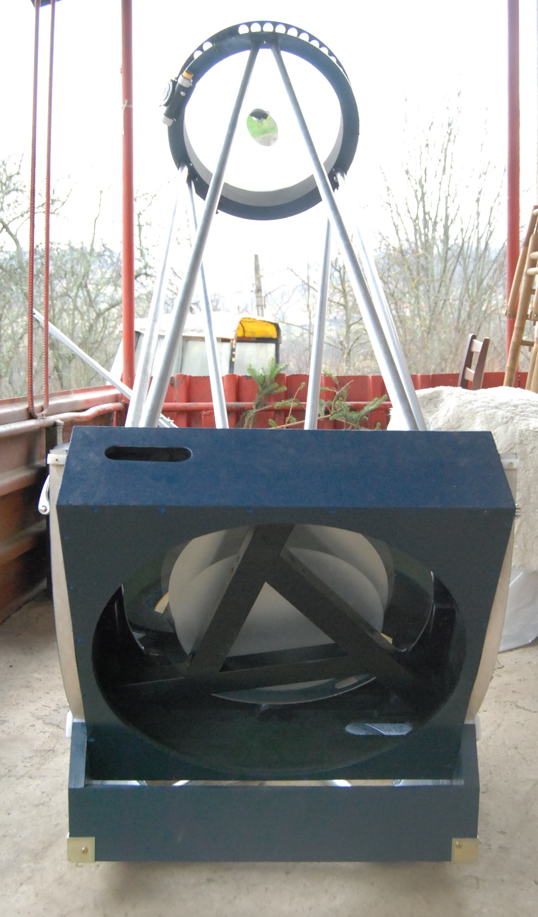 Prima impresie: barele cantaresc cu aproximatie 5kg, cusca secundarei cu focuser si secundara dar fara ocular cantareste undeva la 3,6kg. Raportul focal cam lung face ca, in momentul in care telescopul este inclinat de la 45 de grade catre orizont, sa alunece foarte usor la vale. Daca adaug si ocularul de un kg viteza de coborare sporeste putin. Ar fi pe viitor sa inlocuiesc barele cu unele din fibra de carbon si asa s-ar rezolva balansul, pana atunci am sa adaug fie ceva contragreutati in cusca primarei in spatele oglinzii, fie un arc cu scripete.