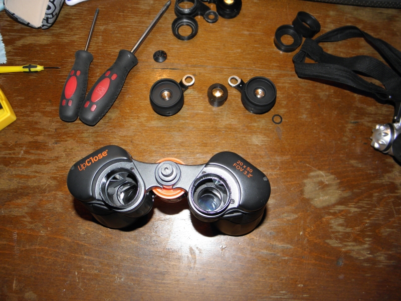 Am plecat de la un Celestron 20x50 care mi-a parut un binoclu inutilizabil (a se vedea eventual review-ul). Si considerand ca singurul punct slab sunt de fapt ocularele, am incercat sa refac putin acest neajuns. Nu stiu in ce masura este util acest post deoarece presupune ca aveti pe langa un Celestron 20x50 si o pereche de oculare (montate in port tub) de la un binoclu BPT 20 x 50. Practic este extrem de simplu. Demontati surubul portocularelor si scoateti cele 2 portoculare. Scoateti mansoanele de cauciuc. Scoateti din ele lentilele si distantierii originali. Largiti cu o freza gaurile din tuburile port oculare astfel incat tuburile port ocular rusesti sa intre inauntru (lejer fortat). Inainte sa glisati tuburile portocular noi plasati 2 distantiere de metal de 1,7 mm diametru (fir de cupru de la conductor electric) intre marginea tubului port ocular si corpul portocular original Celestron. Remontati aparatorile de cauciuc.