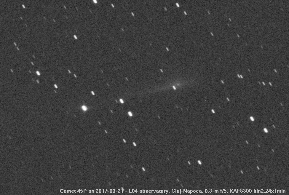 O noua captura la Cometa 45P/Honda-Mrkos-Pajdusakova, 02-03-2017. ED 80, Atik 314L+, 40 X 120 sec bin 1x1 L, CGEM, cu ghidare si soft pentru captura Sequence Generator Pro. Prelucrare cu PixInsight, Astroart 6 si PhotoScape. Magnitudinea cometei conform Stelarium 12.54.