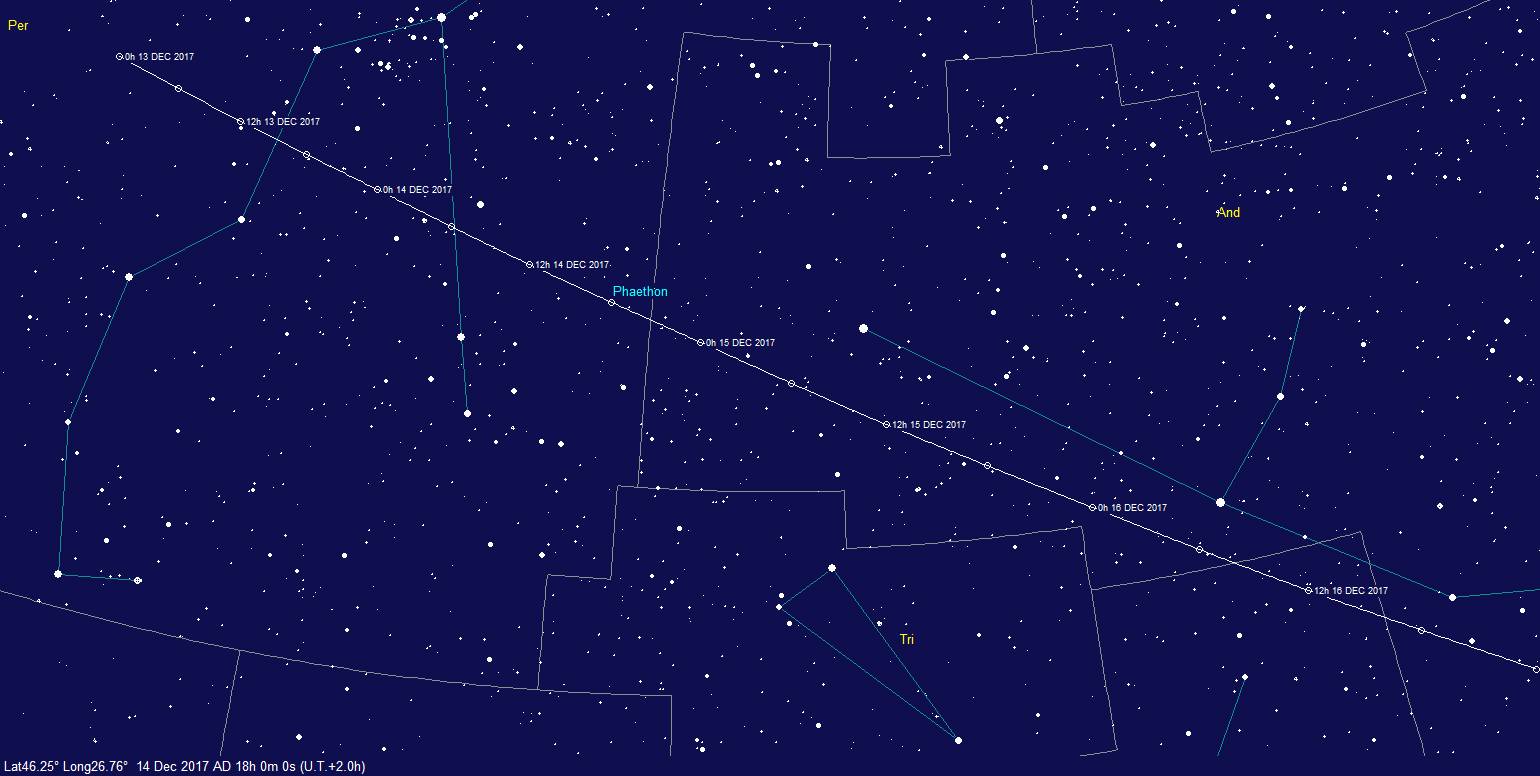 Asteroidul 3200 Phaethon care genereaza curentul meteoric Geminide va trece in noaptea de 16-17 dec. la distanta minima de Pamant, 10.3 mil. km. Va fi cea mai mica distanta intre Terra si asteroidul de 5 km din ultimii 40 de ani.