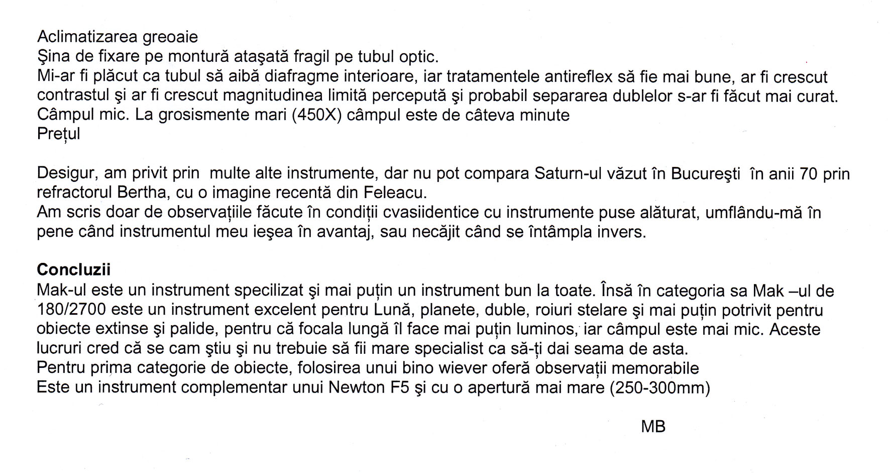 Fac o actualizare la review-ul postat cu puțin timp în urmă. În tabăra de la Lisa din anul acesta am avut șansa să punem (cu Liviu aka StarChild) în paralel mak-ul de 180 cu un refractor acromat SW F5. Seeingul nu a fost grozav. La un grosismernt de caa 90X am vizat gamma andromedae. Vizual s-au putut discerne două componente A-BC la o separare de caa 9''. Ambele instrumente au separat componentele (mak-ul cu cu lejeritate) și au relevat contrastul de culoare dintre componente. Imaginea furnizată de mak mi s-a părut mai curată și mai clară, deși ocularul folosit la mak (un plosl no name de 32 mm) era mai puțin isprăvit decît ocularul cu care Liviu a armat refractorul său- un Ethos de 8 mm.