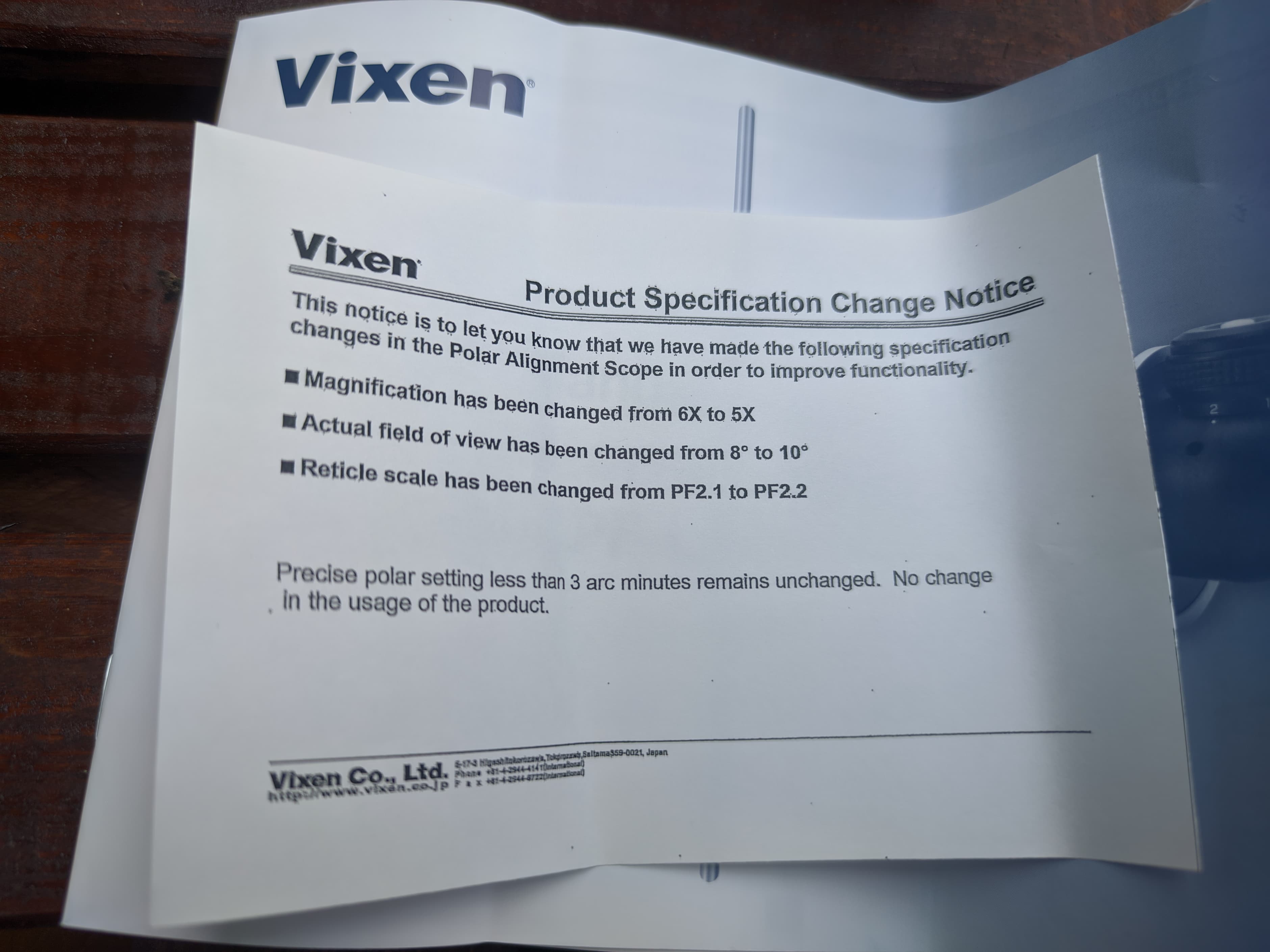 In urma unor intentii nepuse in practica (sau mai bine zis proiect in care am inceput, romaneste, cu accesoriile) am ramas cu o luneta polara Vixen Polarie PF-L II. Facuta in Japonia, excelenta din toate punctele de vedere, mecanic si optic. Constructie metalica, marire 5x, camp vizual de 10°, reticul iluminat, aplicatie companion; este absolut noua in cutie, cu toate hartoagele cu care a venit.