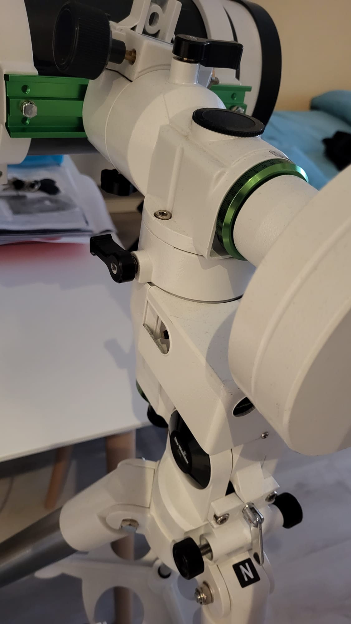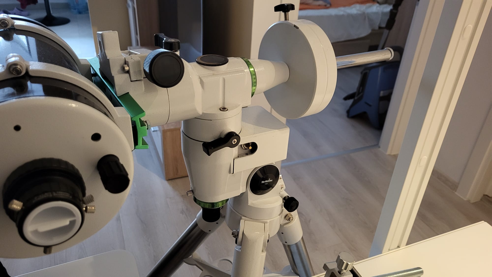 Montura a fost folosita in ultimii doi ani la mai multe iesiri sau cel putin pentru a sustine telescopul din imagine, in casa. Vizual arata bine, a fost pastrata cu grija si nu a fost desfacuta niciodata. La rotirea butonului pentru urmarirea in plan orizontal (asa cum este pozitionata in imagini) si misca uniform, la rotirea butonului pentru sus/ jos, are un mers usor neuniform intr-o pozitie anume, dar fara sa aiba absolut niciun rateu/ scapare.