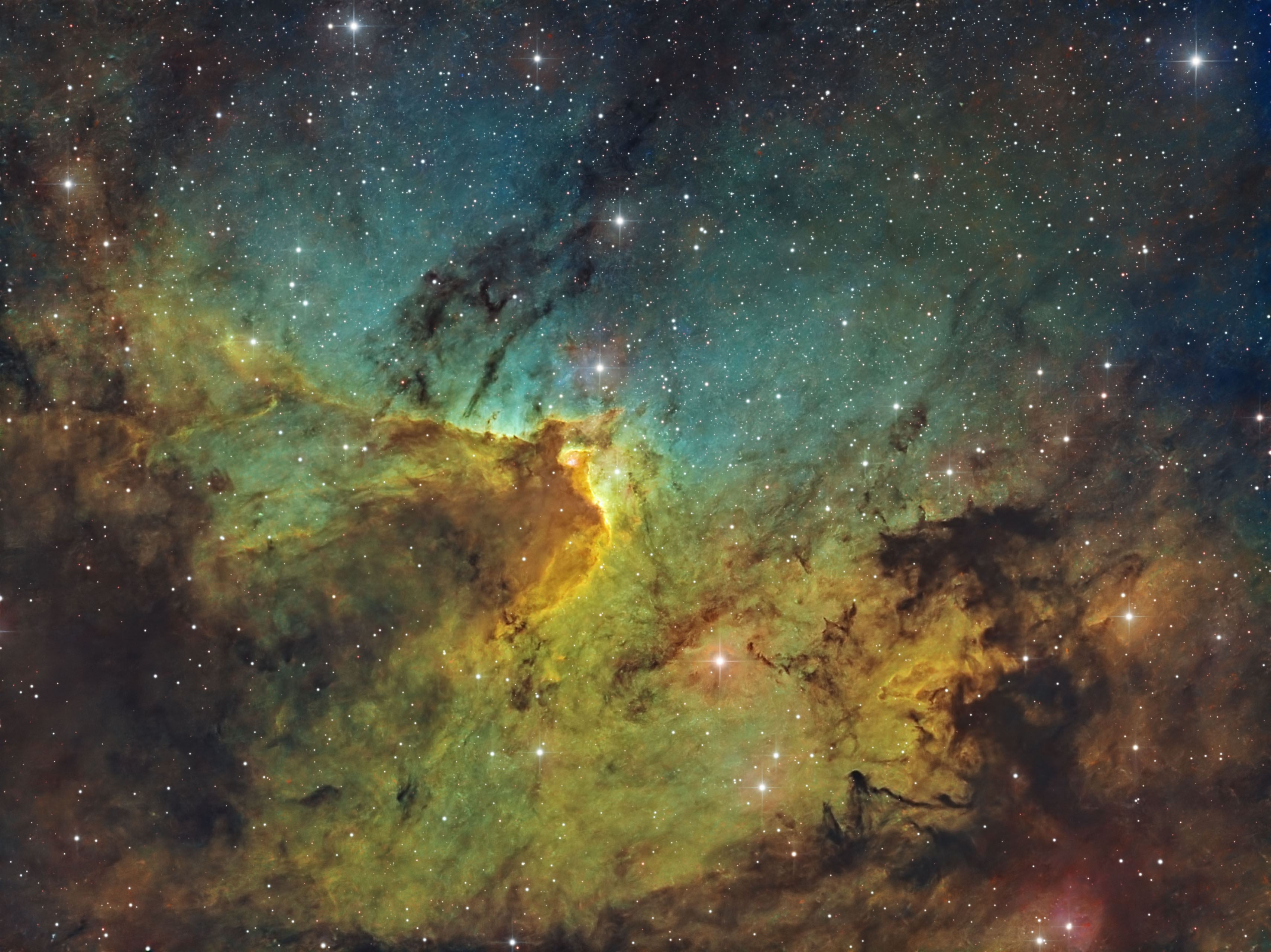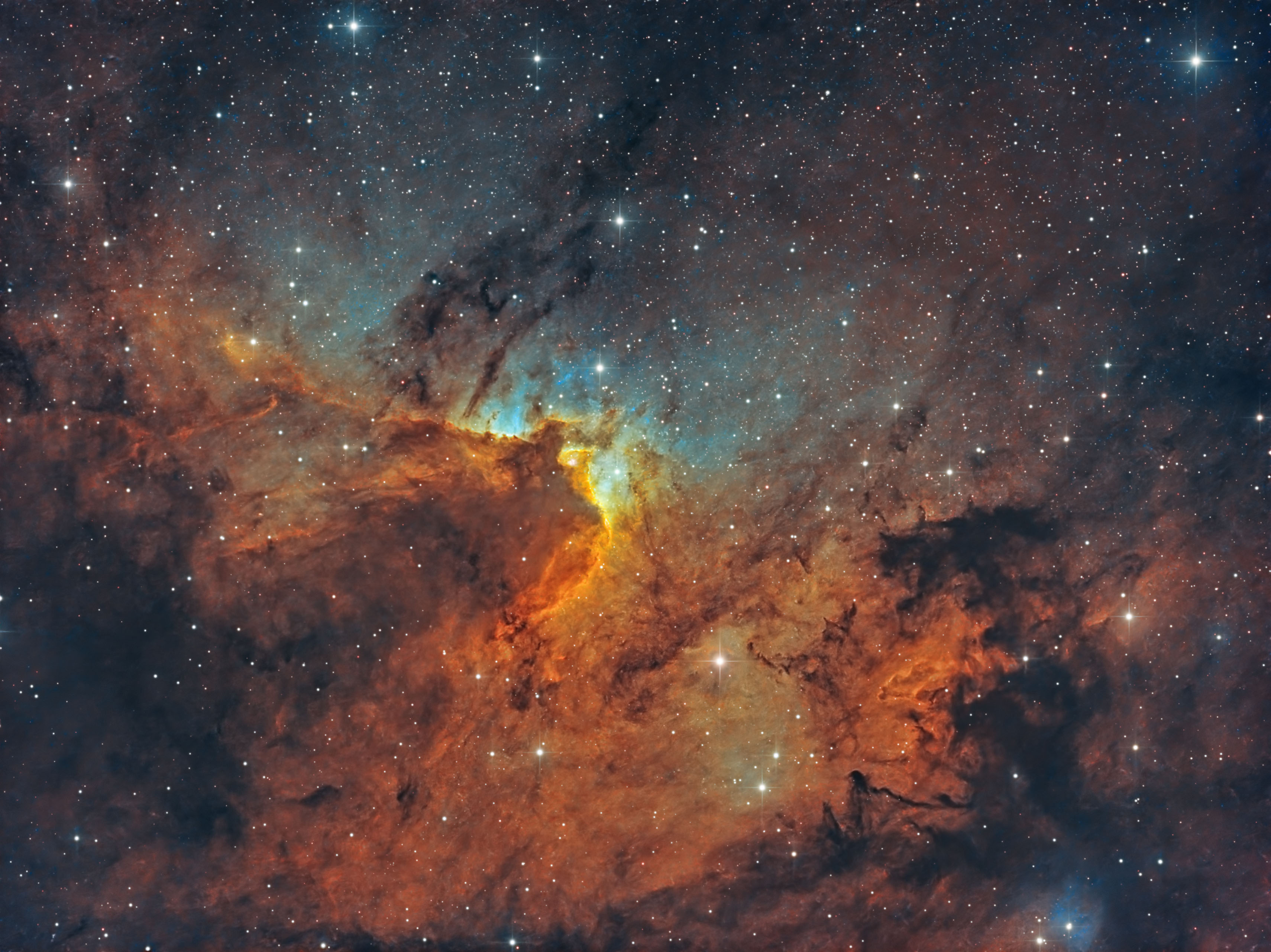 Captura facuta in patru nopti(13-16 noiembrie). Cadre: Ha-58x300", OIII-57x300", SII-108x300". Newton 8" f4, ASI1600MM Pro.