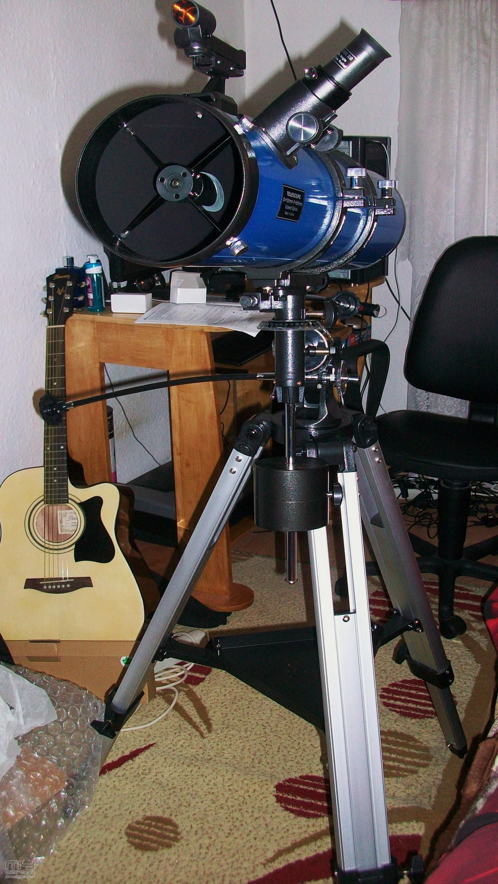 Poate nu vad eu bine (varsta ....). Este un newtonian pe o montura EQ (probabil 2 fara motorizare) sub sau cel mult 114 mm. Cautatorul este profi ... cu led rosu. Bun instrumentul si poate fi upgradat.