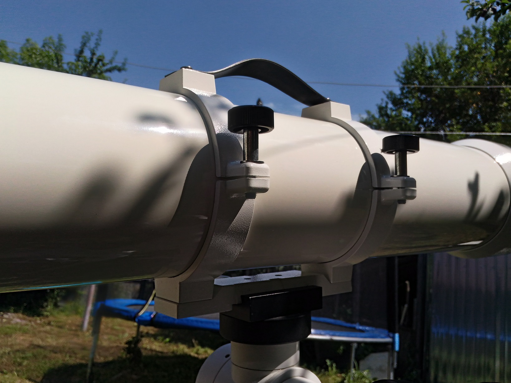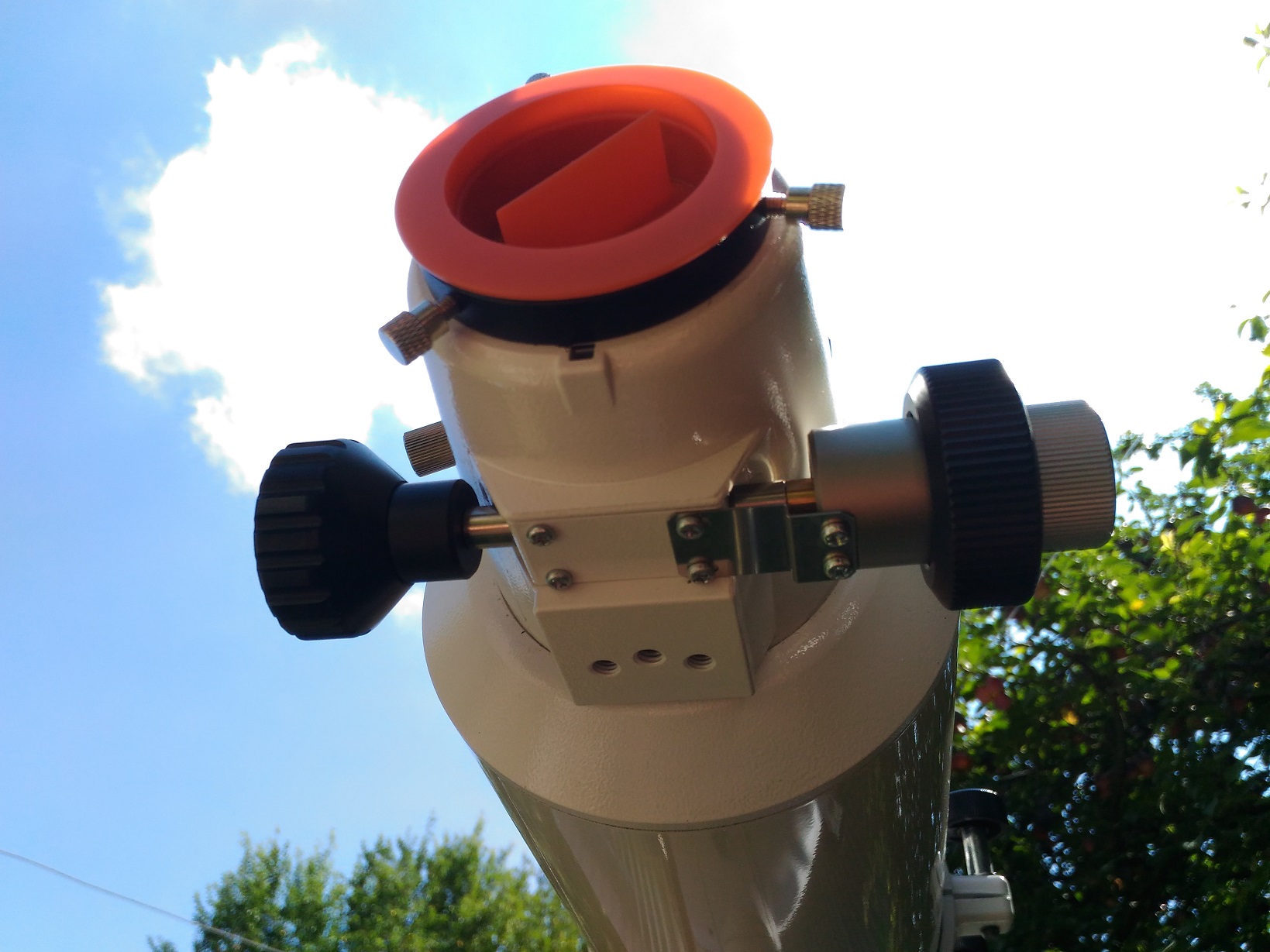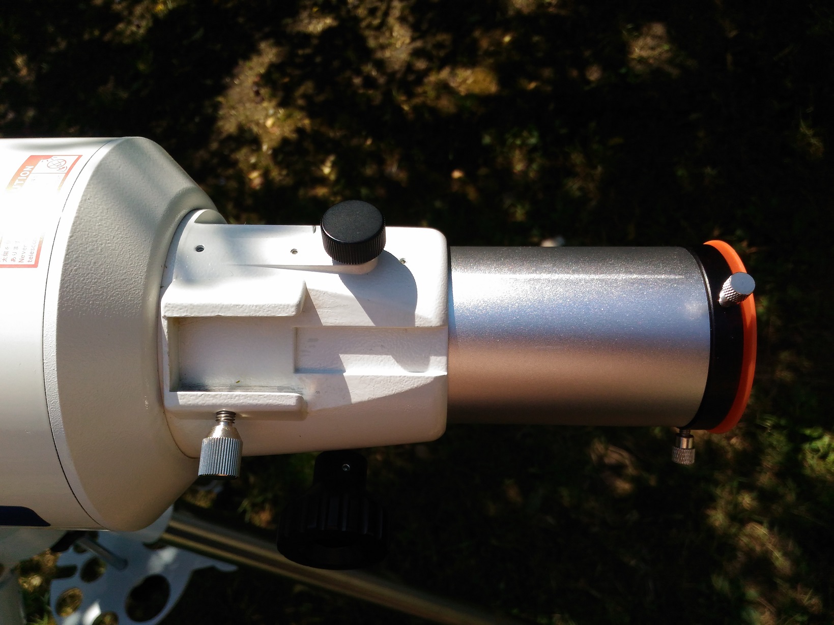 Telescop maricel, foarte aratos si bine “inchegat” . Pe sinele de prindere are ca maner o curea care la prima impresie pare oarecum fragila dar isi face treaba cu brio. Focuser dual speed pe 2” de tip Rack and Pinion foarte précis si fin in folosire. Are o cursa de 8.2 cm, este sufficient de stabil sa tina diagonala si ocularele de 2” folosite si deci tine un dslr gras fara stress, doar este un veritabil astrograf. Se vindea fara cautator, deci se poate adapata unul dupa plac, ce folosesc ? Ce gasesc la indemana caci am cam 10 tipuri. Are un dewshield detasabil si capacul este de metal. Antireflexul cu tenta verzuie.