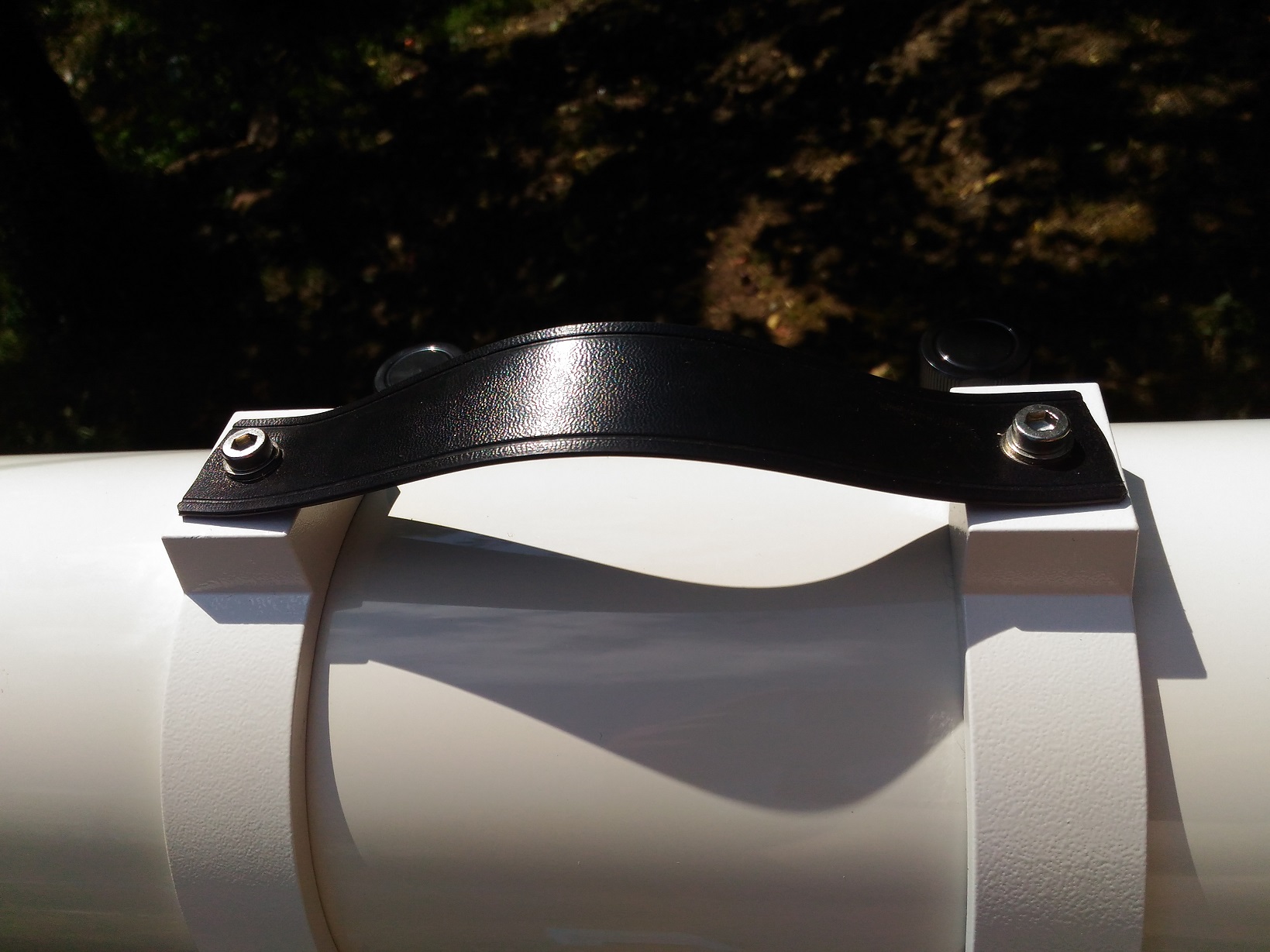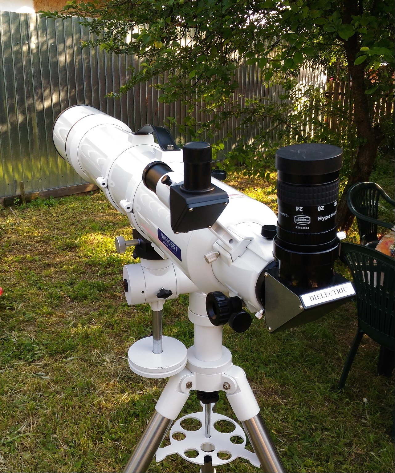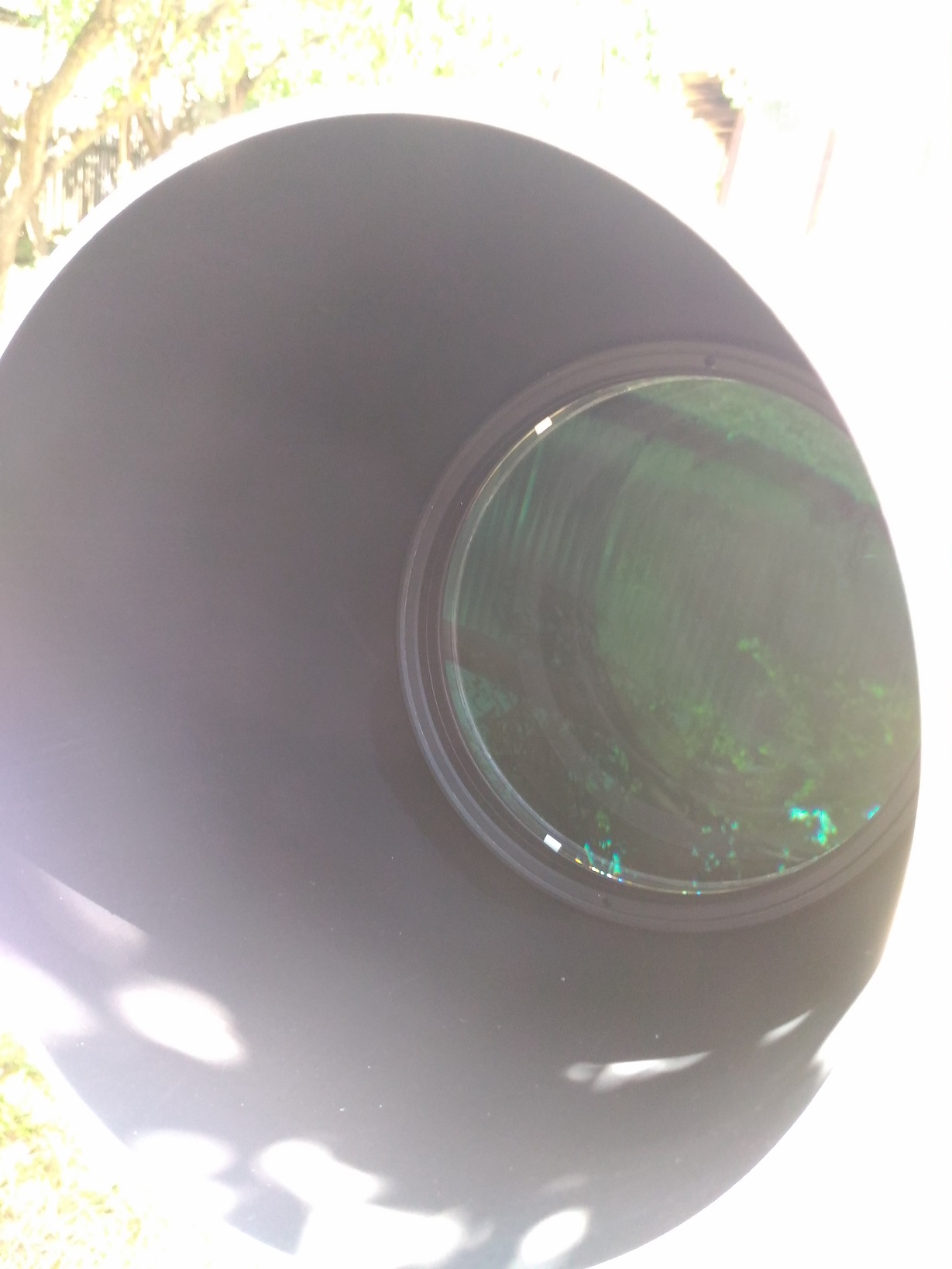 Telescop maricel, foarte aratos si bine “inchegat” . Pe sinele de prindere are ca maner o curea care la prima impresie pare oarecum fragila dar isi face treaba cu brio. Focuser dual speed pe 2” de tip Rack and Pinion foarte précis si fin in folosire. Are o cursa de 8.2 cm, este sufficient de stabil sa tina diagonala si ocularele de 2” folosite si deci tine un dslr gras fara stress, doar este un veritabil astrograf. Se vindea fara cautator, deci se poate adapata unul dupa plac, ce folosesc ? Ce gasesc la indemana caci am cam 10 tipuri. Are un dewshield detasabil si capacul este de metal. Antireflexul cu tenta verzuie.