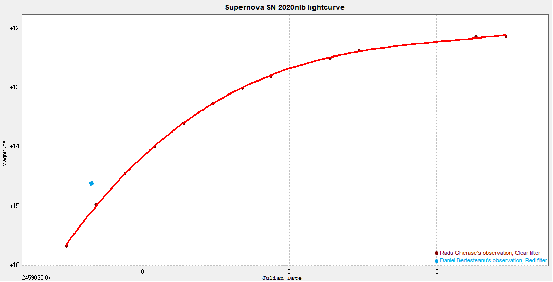 Imediat se da alerta iar in cateva ore supernova SN 2020nlb este observata de colegii nostri Radu Gherase si Daniel Bertesteanu pentru confirmare, determinarea magnitudinii si a evolutiei in timp a acestei supernove.