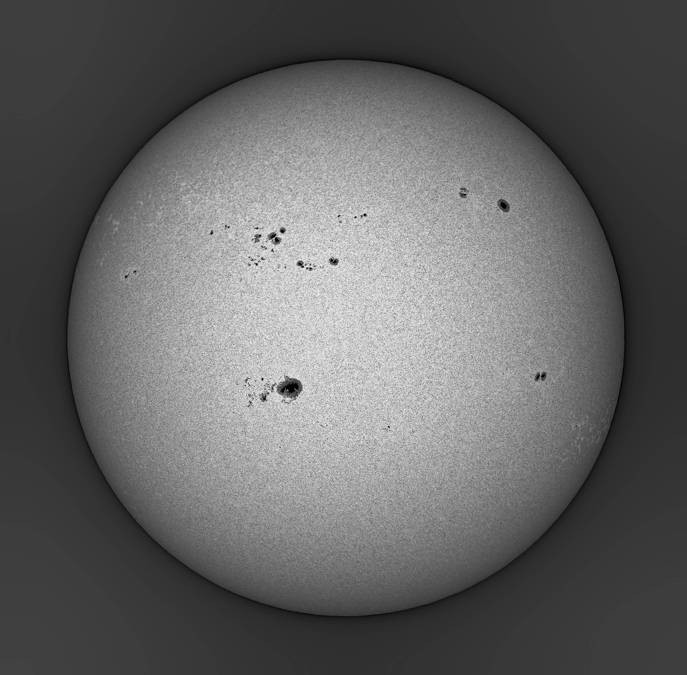 O imagine cu discul solar de astazi, fotografiat cu camera foto Canon 450D prin telescopul de 114mm cu filtru UHC care mareste contrastul petelor solare. Rezultatul insa a iesit destul de slab, din cauza seeing-ului nu prea bun dar si a camerei care nu exceleaza in astrofoto planetar/solar ci mai mult la DSO.