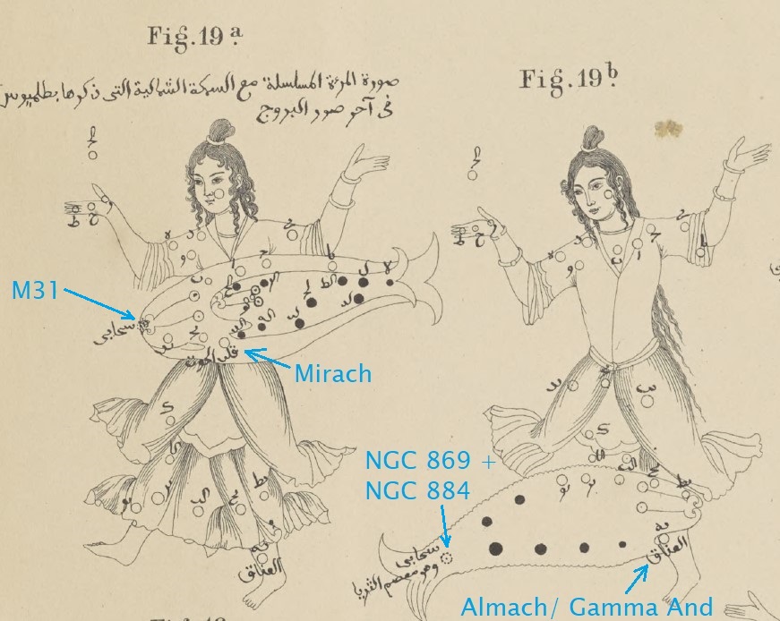 Cazul lui Andromeda este insa unul grav. Era denumita ''Femeia inlantuita'' dar si ''Femeia care n-a avut niciodata sot'' ! Modul in care este mentionata Marea Nebuloasa din Andromeda este interesant. Galaxia este folosita ca punct de reper pentru a lamuri o constelatie/ peste, introdusa de Ptolomeu. Aceasta mentionare in treacat (si ca punct de reper !) este un puternic indiciu ca galaxia era bine cunoscuta.