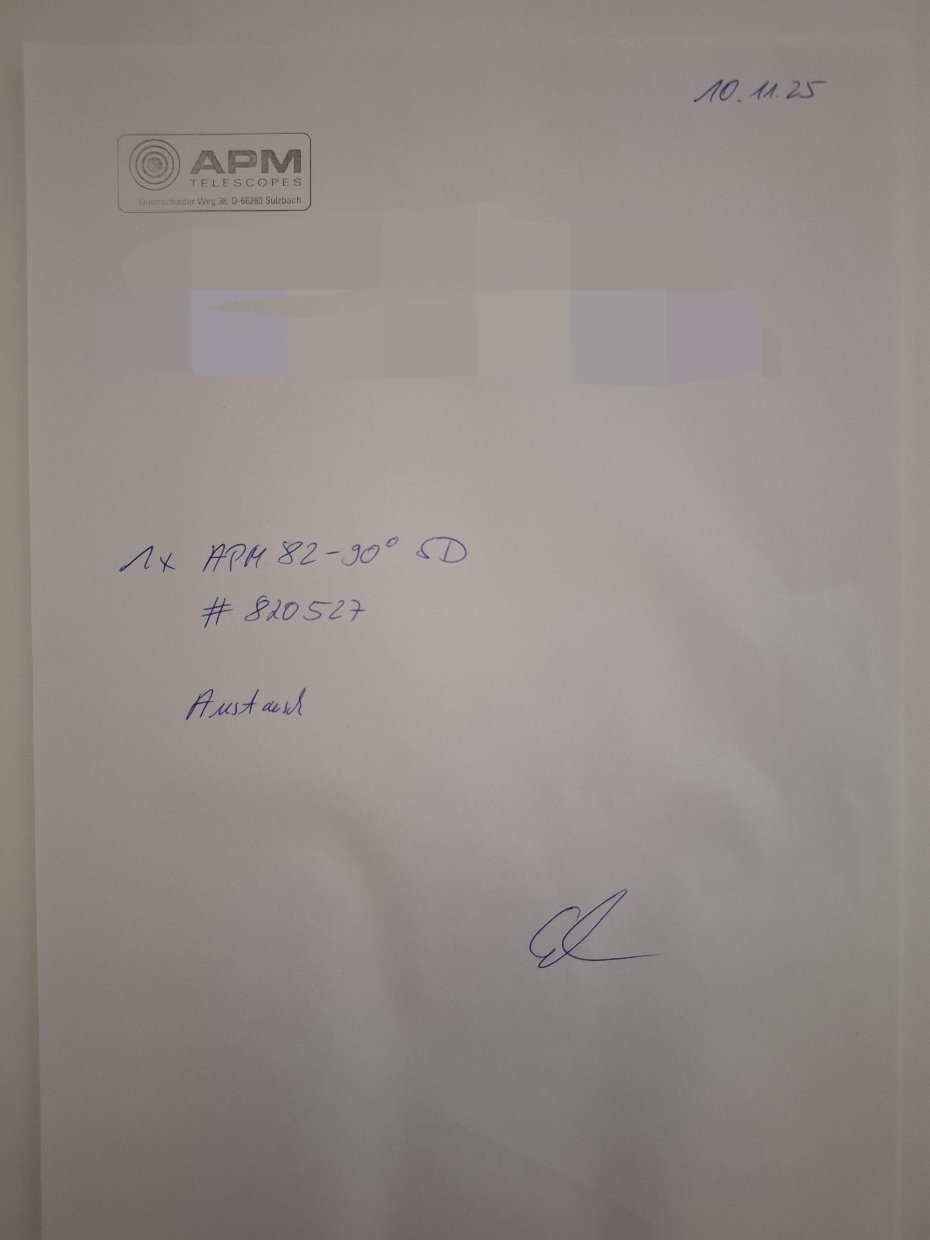 Saptamana trecuta am primit de la APM un nou binoclu 82mm/90° SD APO, acesta inlocuind binoclul cumparat anul trecut in decembrie. Pentru ca primul avea o oarecare aberatie cromatica, nimic grav dar era acolo, APM a hotarat sa imi dea altul in schimb, bineinteles nou, dintr-un alt lot venit anul acesta.