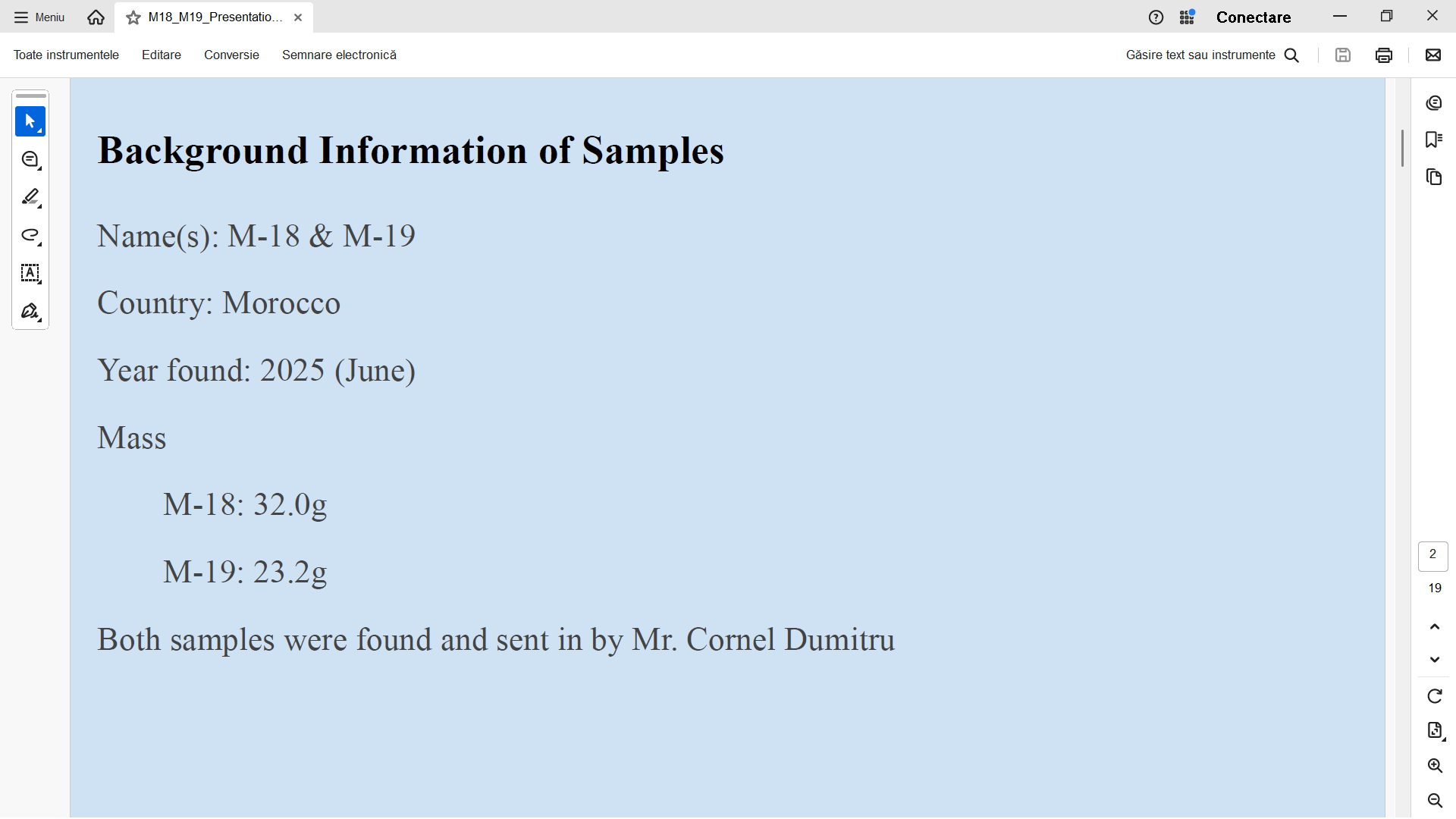 | Analiza meteoritilor M-18 si M19 |