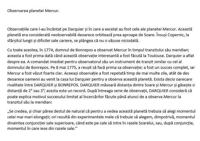Una dintre personalitatile mele preferate din Istoria Astronomiei este Antoine Darquier. Atasez ca imagine traducerea pasajului dintr-o nota biografica despre el. Aflam de acolo ca primul care a reusit sa observe pe Mercur pe cerul de zi si in apropierea Soarelui a fost astronomul Bonrepos in 1774. Afland aceasta, Darquier s-a ambitionat si a reusit si el pe 8 Mai 1775. Observatia a fost un succes atat de mare incat a trebuit repetata in zilele urmatoare pentru curiosii care au dat navala.