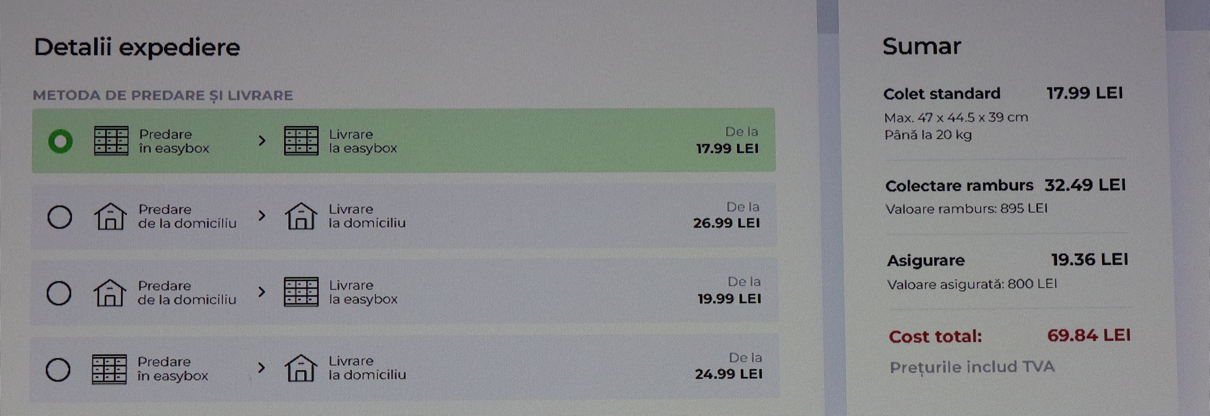 Intre timp am amanat trimiterea, vorbind cu destinatarul, si am incercat la Fan Curier. Surpriza. Aici aceeasi trimitere costa doar 35 de lei. Cu tot cu ramburs. Nu stiu daca e si asigurata, ca pe formularul de comanda nu apare asa ceva. Dar si asa, tot e mai ieftin decat la Easybox-ul Sameday, unde ar fi costat 50 lei fara asigurare. Sper sa ramana asa.