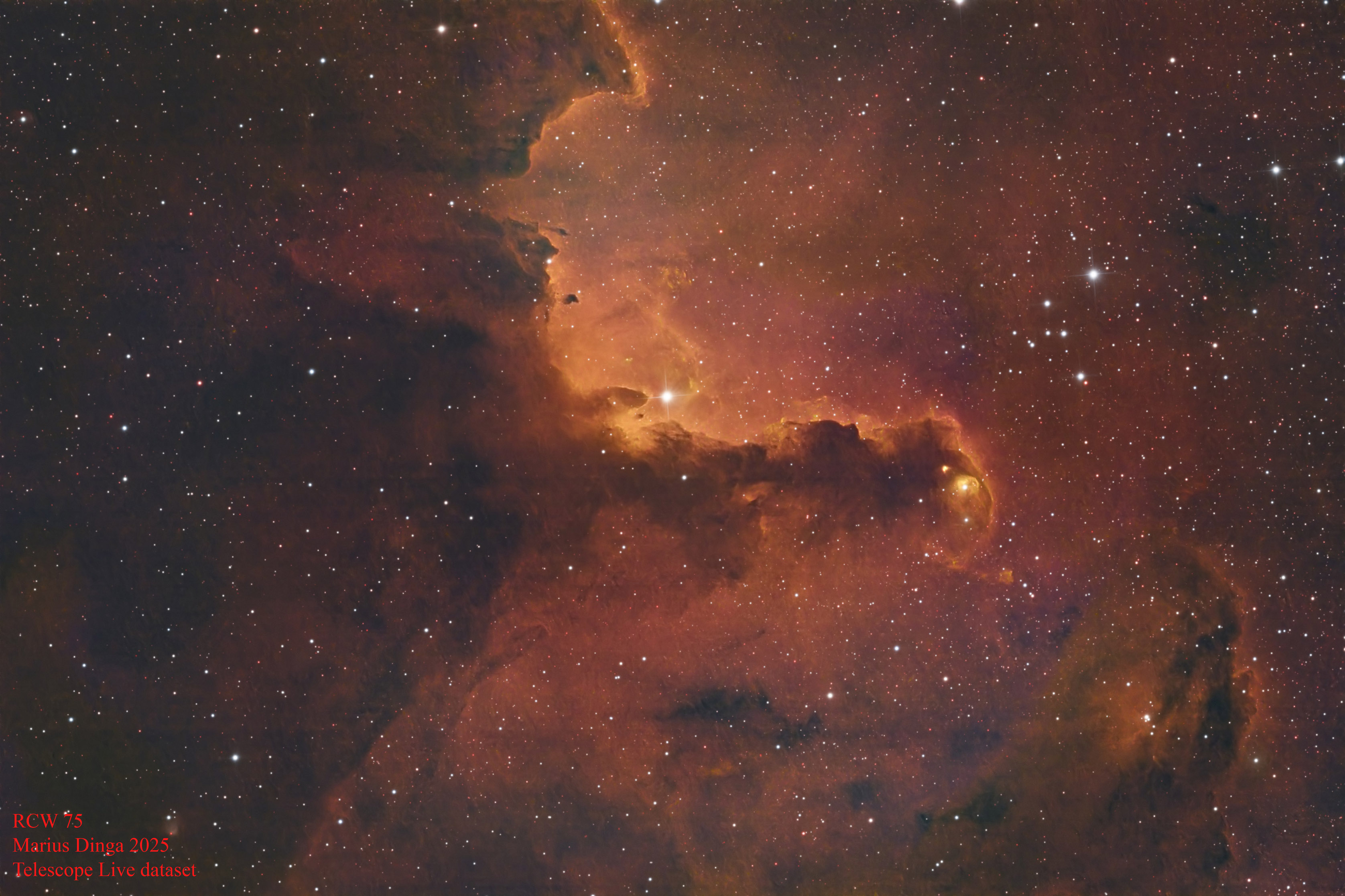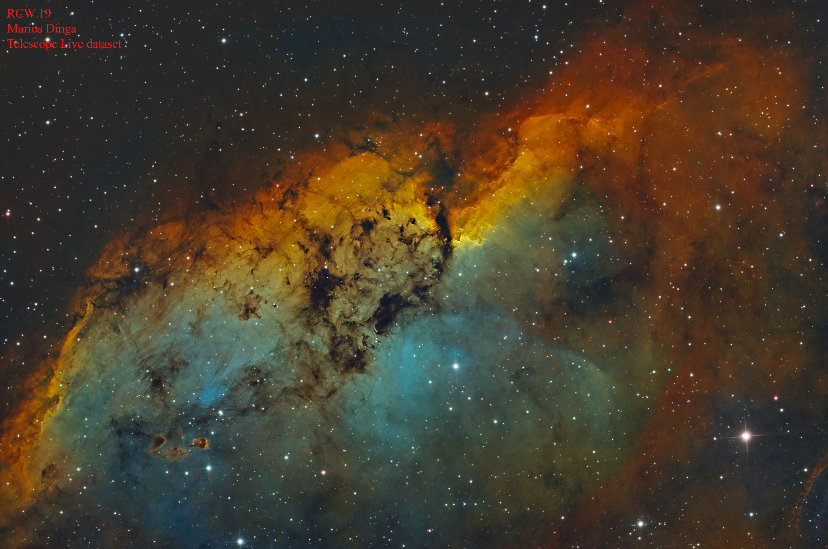 O prima poza- RCW 19, nebuloasa de emisie din Pupis. Imagine SHO. Cadre de la Telescope Live.