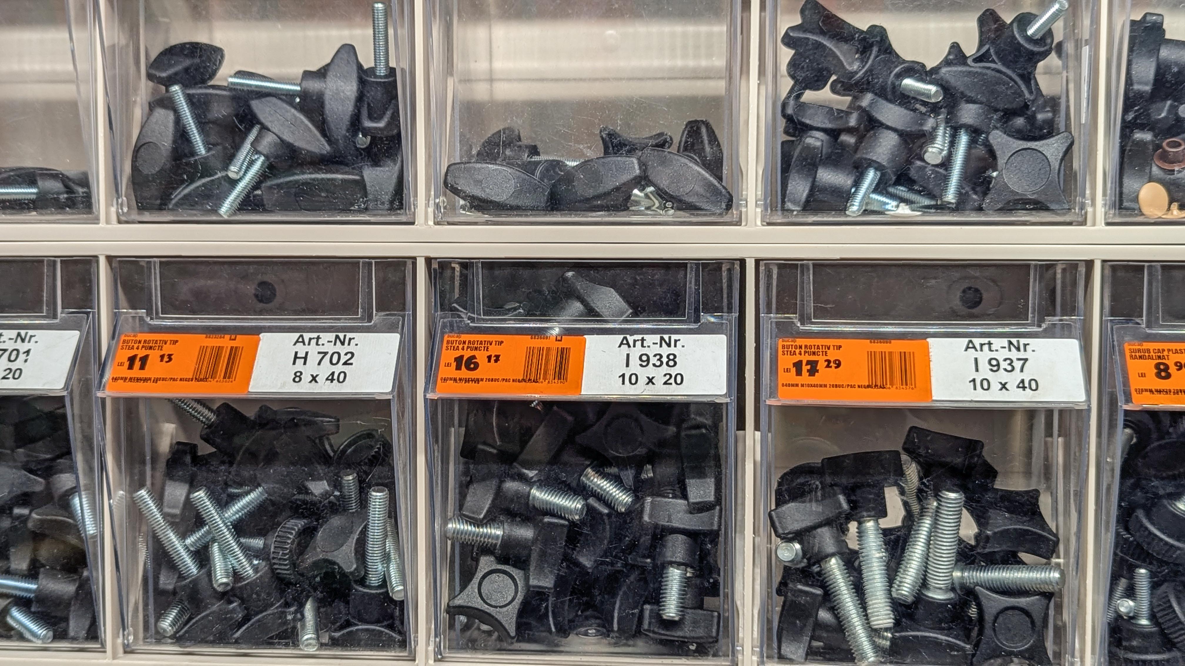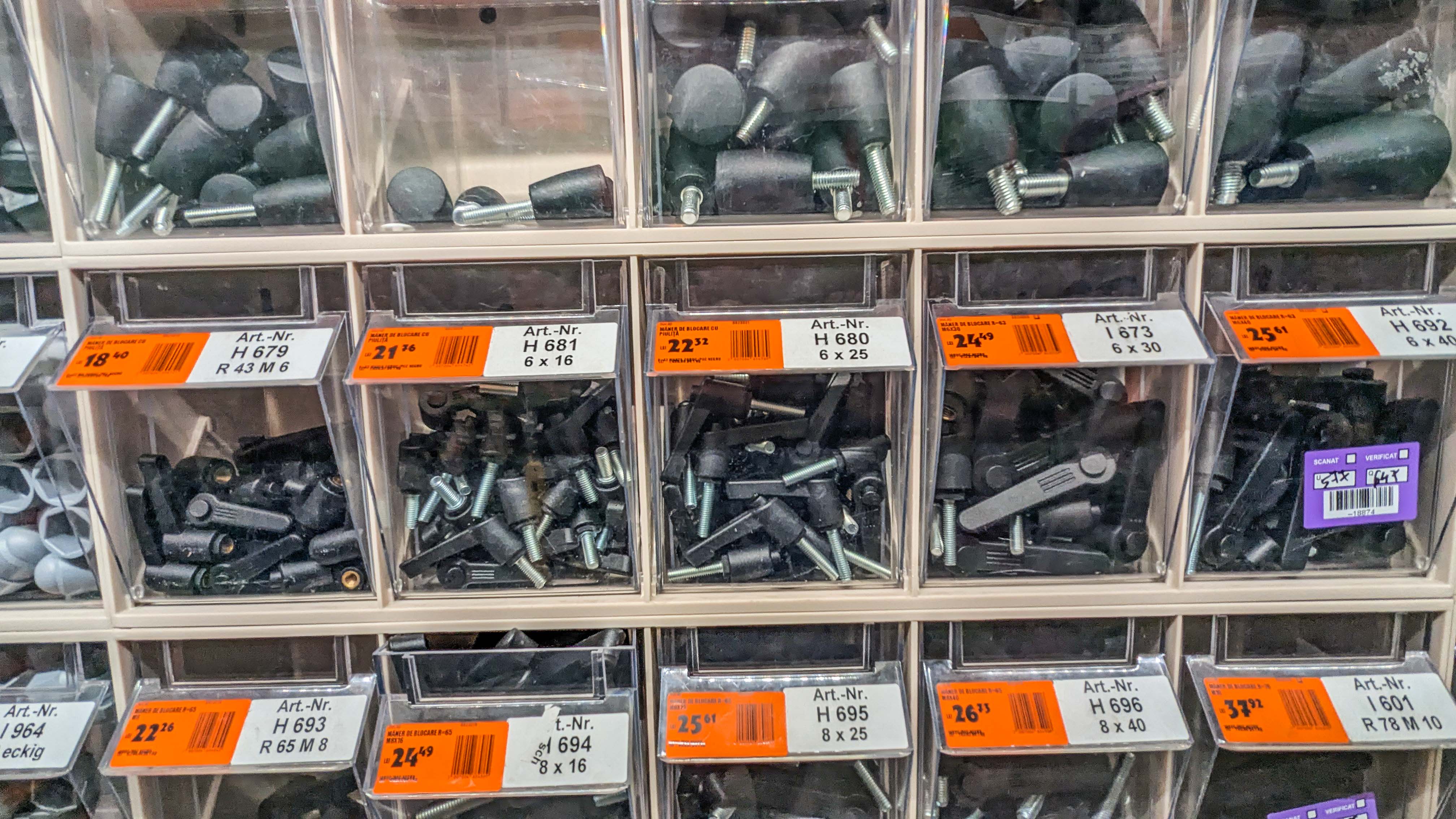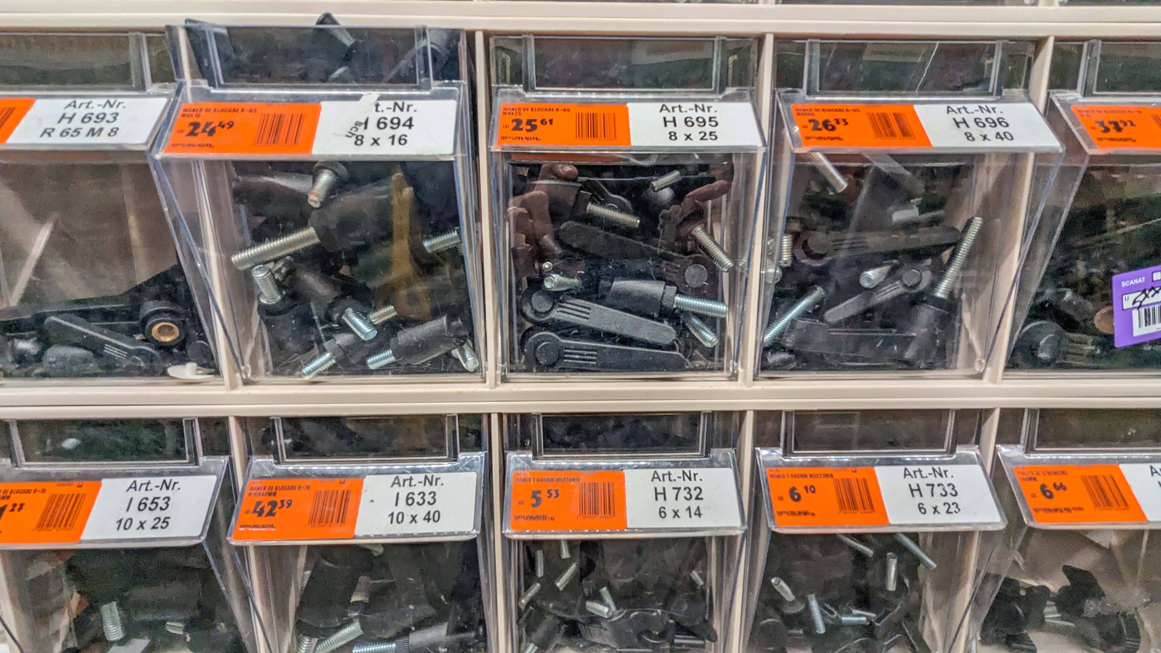 De prin periplurile zilnice, atrag atentia nu asupra suruburilor metrice sau imperiale, ci asupra raionului cu rozete, manete, arcuri si inserturi filetate diverse tipuri si modele. Sunt vreo cativa mp de sertare la hornbach: