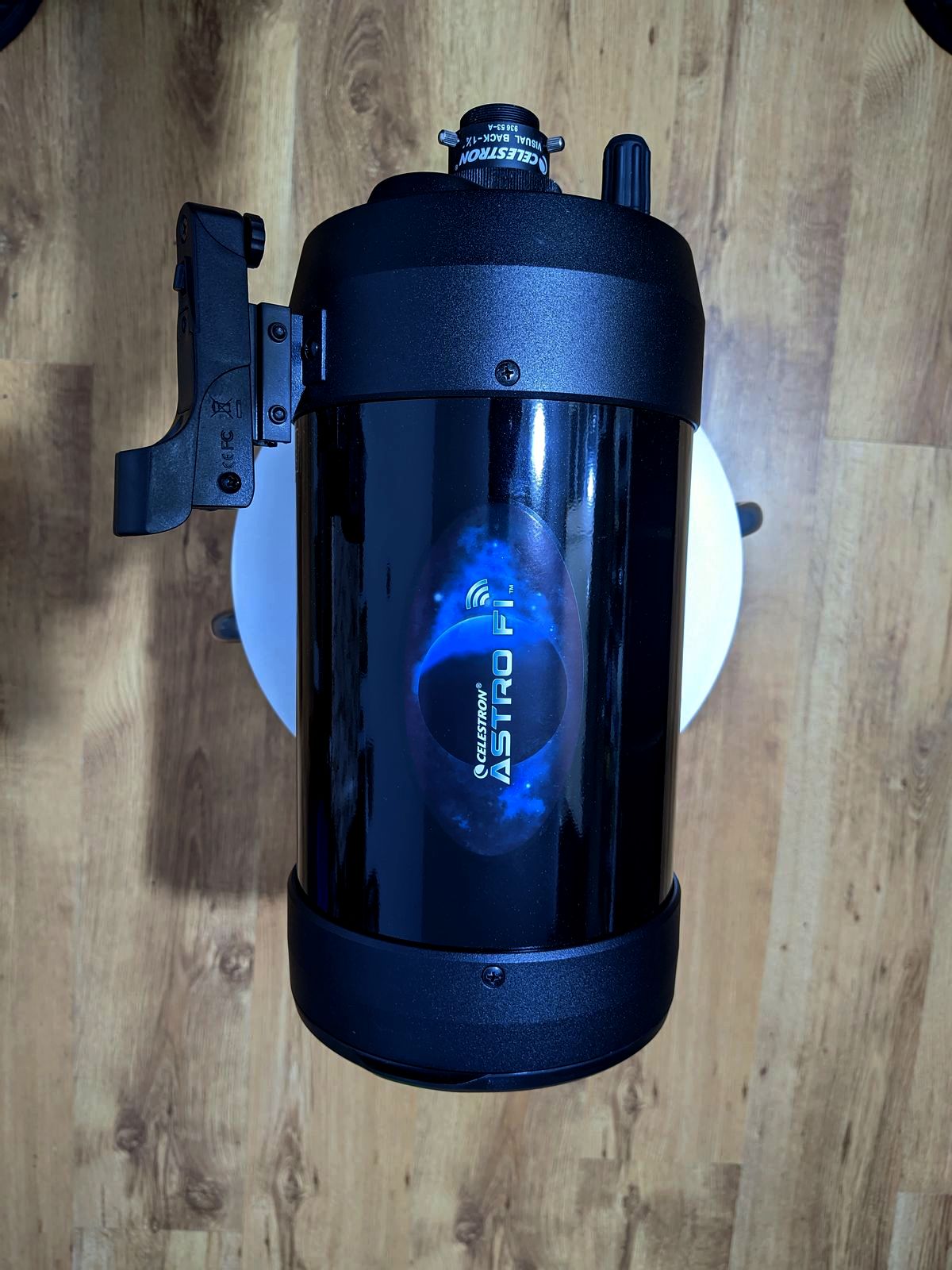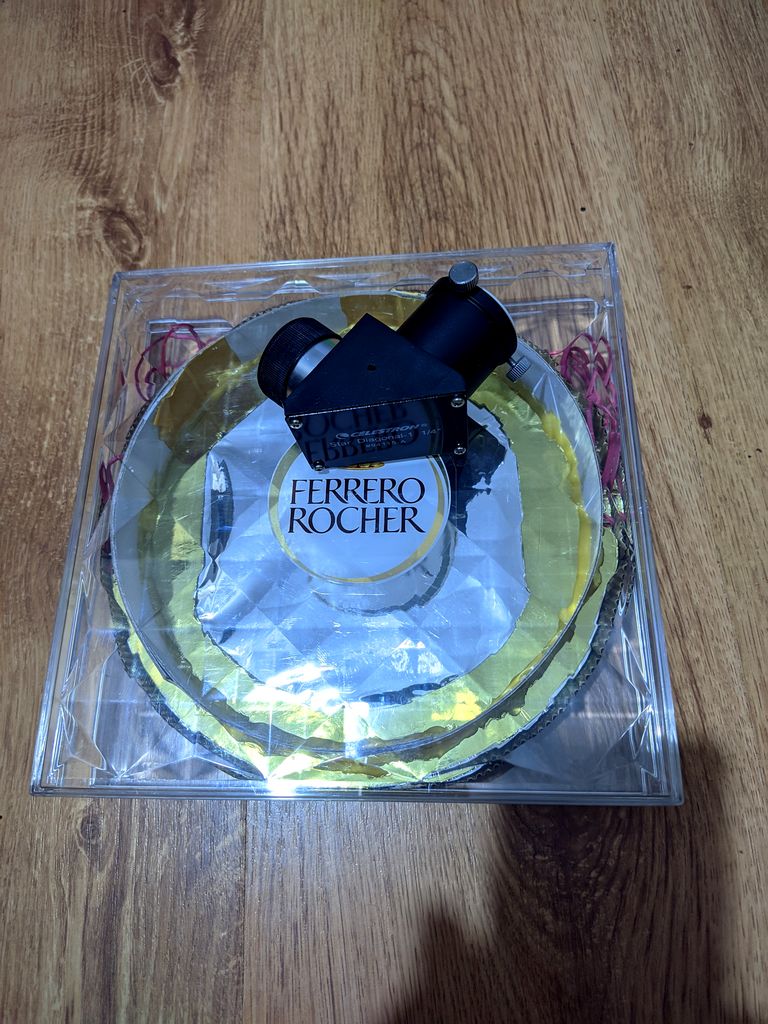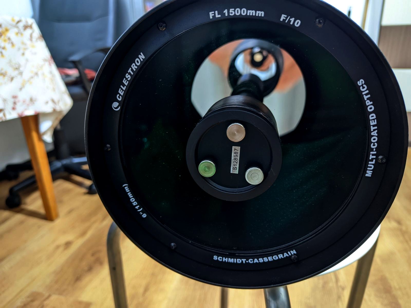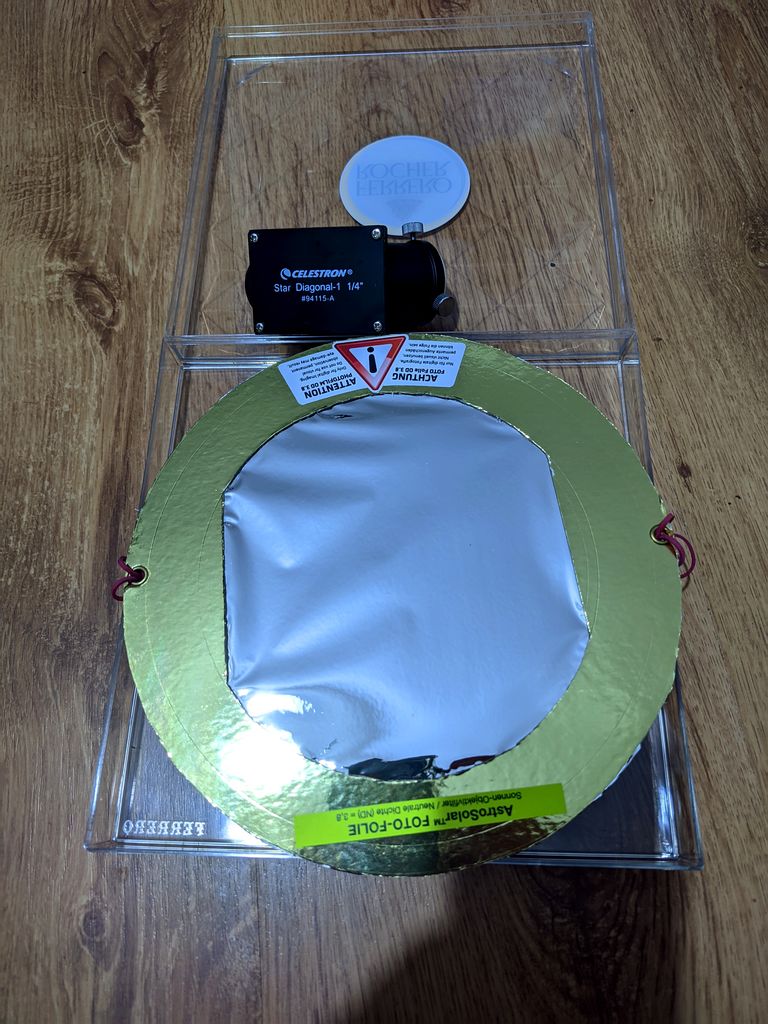 Tubul optic are ca dotari o prisma diagonala Celestron (cea originala), un cautator cu punct rosu, un filtru solar facut de mine si un adaptor pentru telefon (cel original).