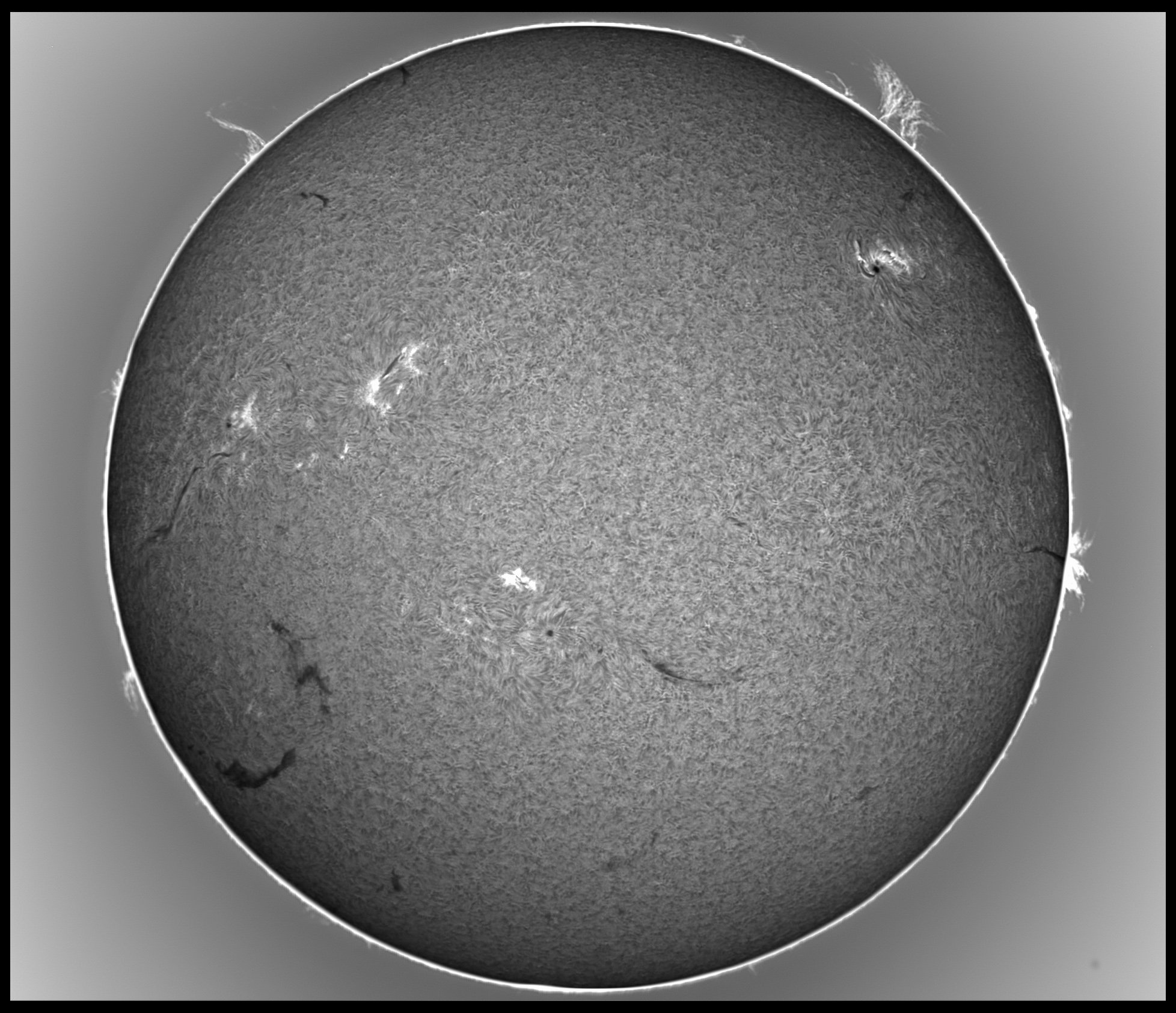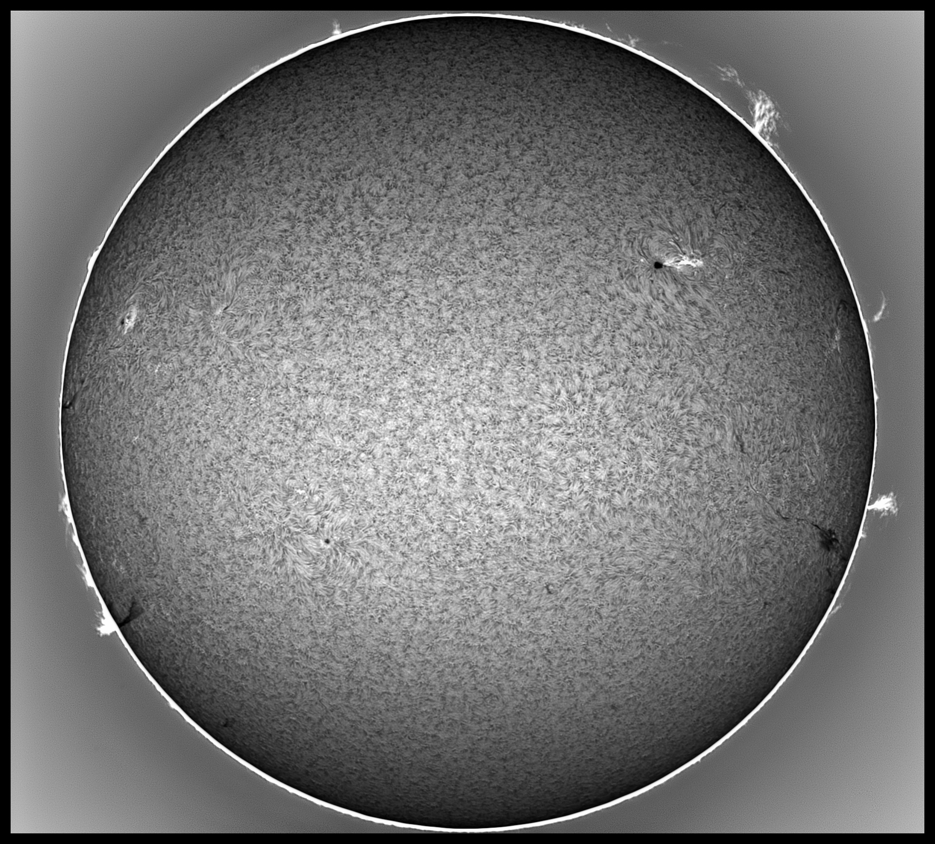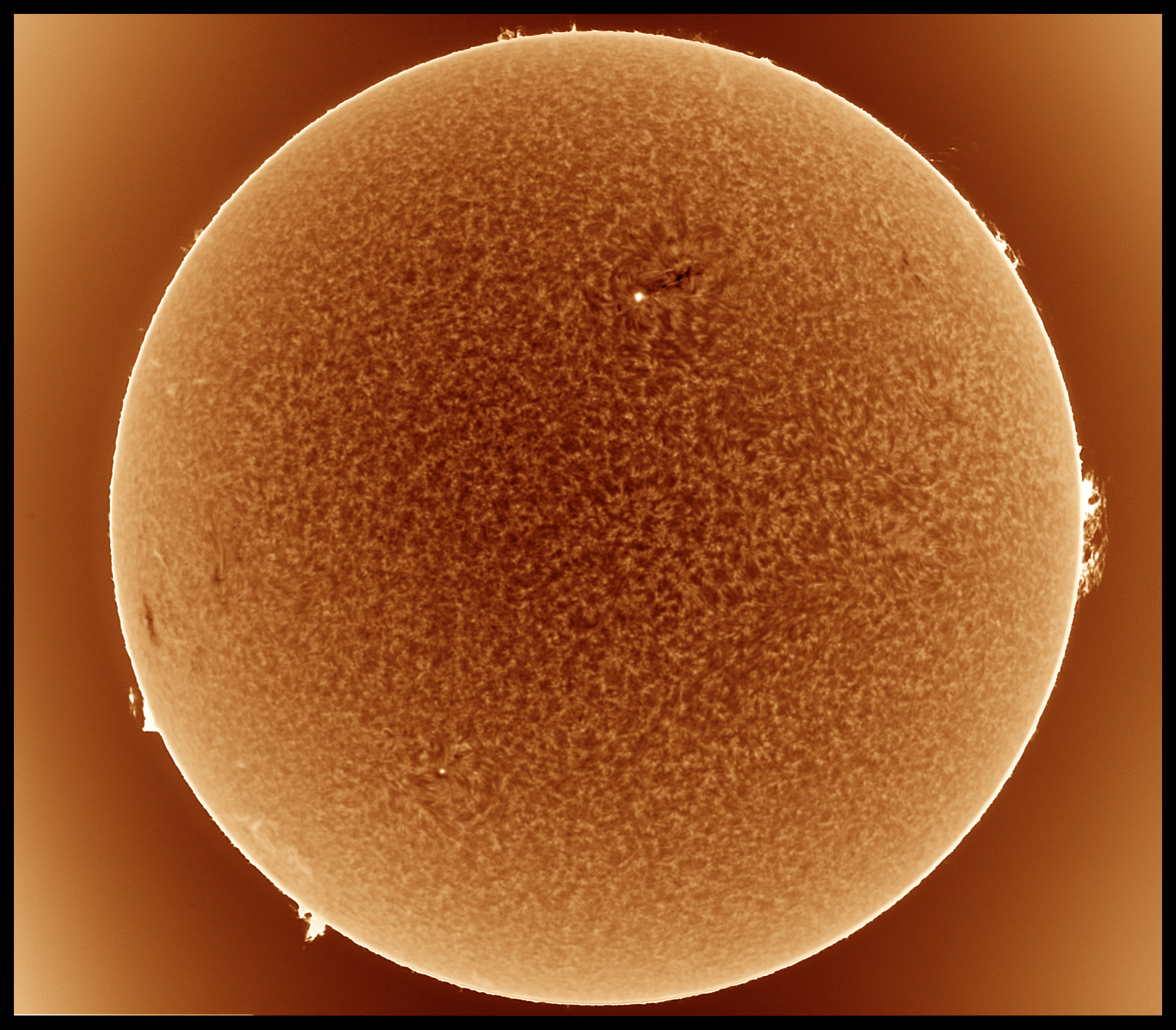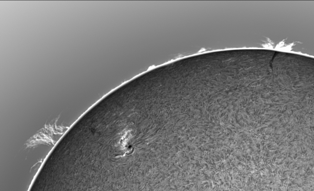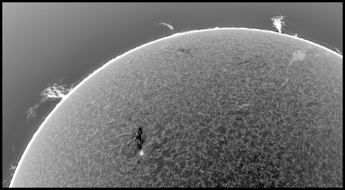 Prezint noi imagini cu Soarele de astazi in H-alpha, scanat cu SHG80mm pe la pranz, inainte sa se strice vremea. Pe discul solar, regiunea AR 4419 din emisfera nordica se dezvolta vertiginos, avand o pata solara uriasa si un grup de pete mai mici si pori, ce au o polaritate magnetica opusa fata de pata solara mare, iar in stanga petei mari se afla o zona luminoasa activa vizibila in H-alpha, suprapusa peste grupul de pete mici si pori ale regiunii AR 4419. Cealalta regiune din emisfera sudica, anume AR 4415, cu o singura pata solara de forma circulara, a ramas stabila de cand a aparut pe fata vizibila a discului solar. Pe limb, aspectul protuberantelor s-a mai schimbat, unele au disparut, altele au aparut in alte locuri de pe limb.