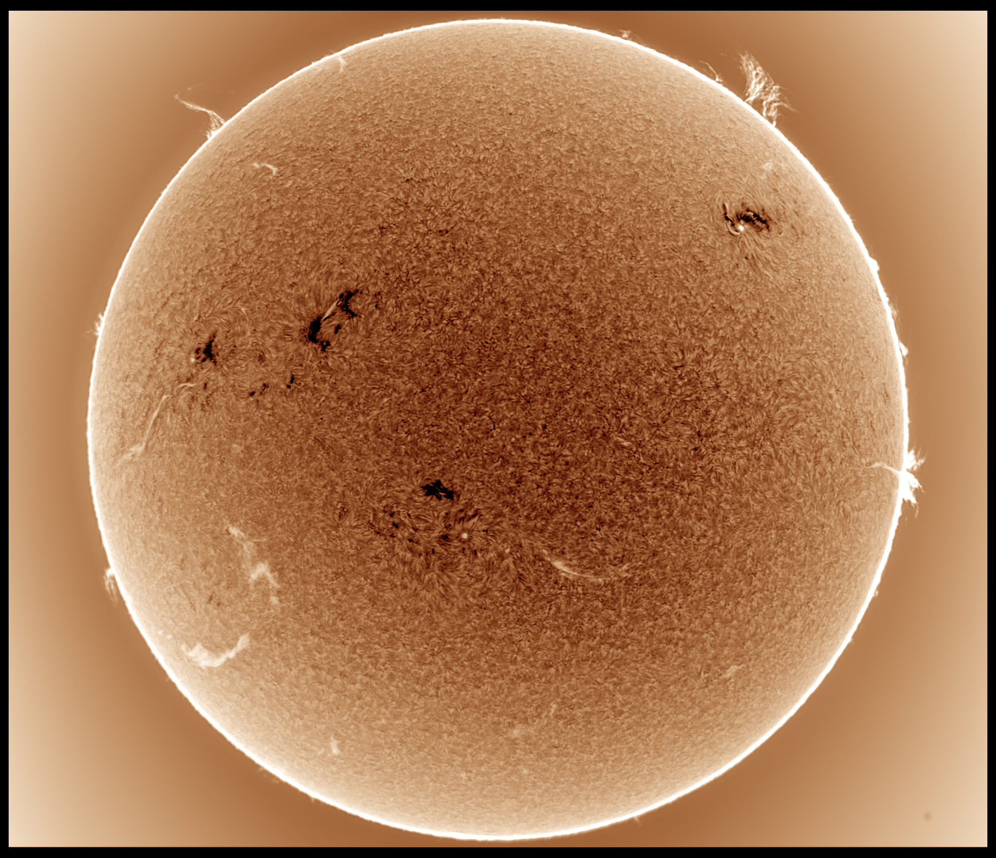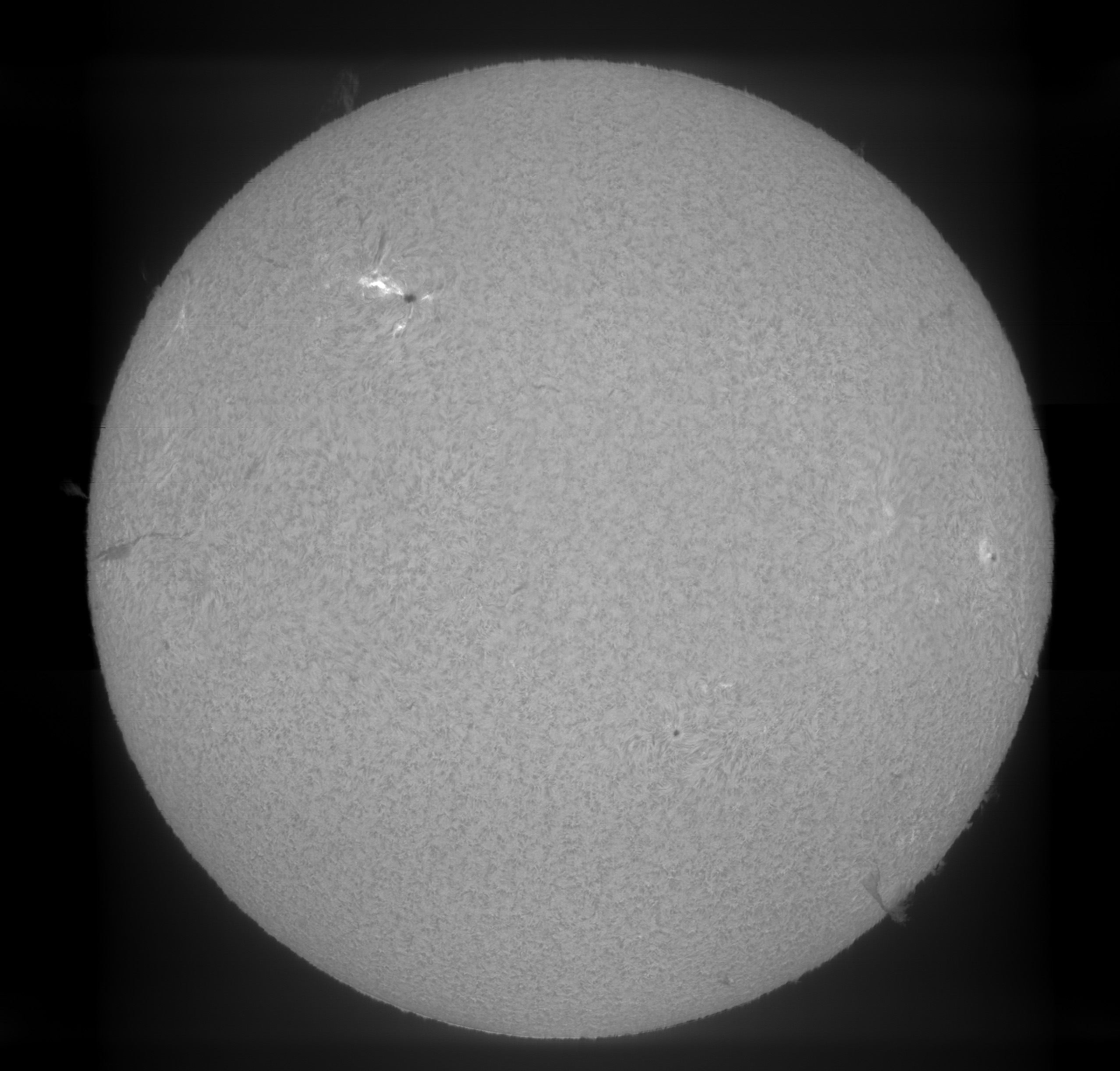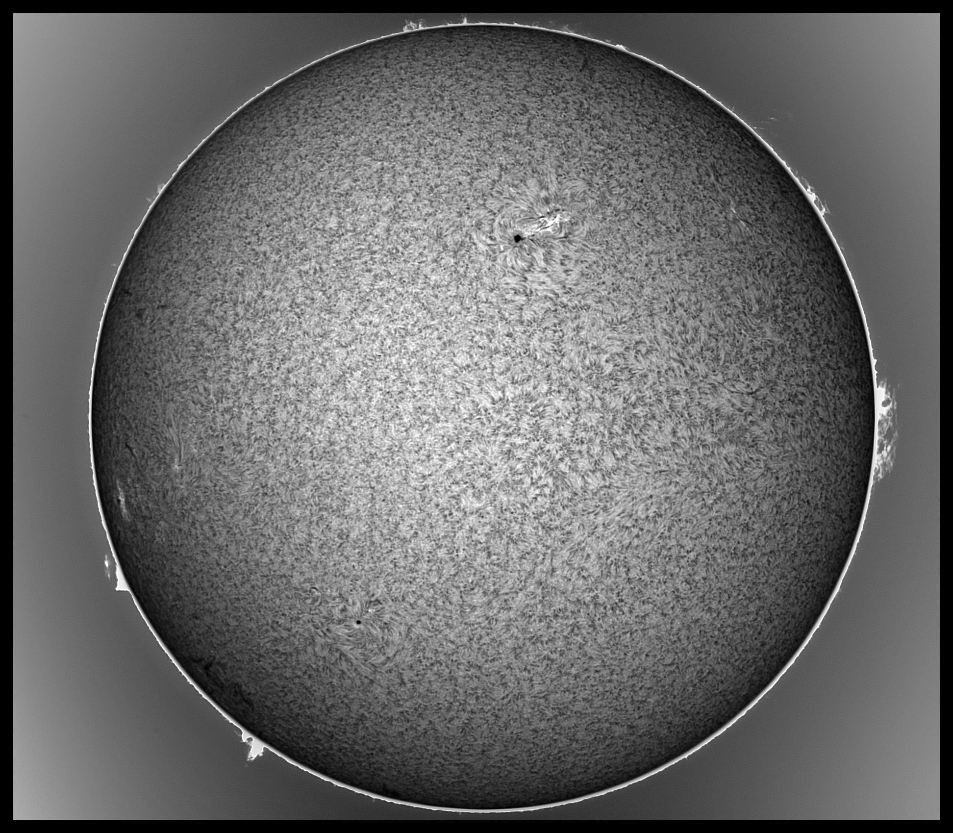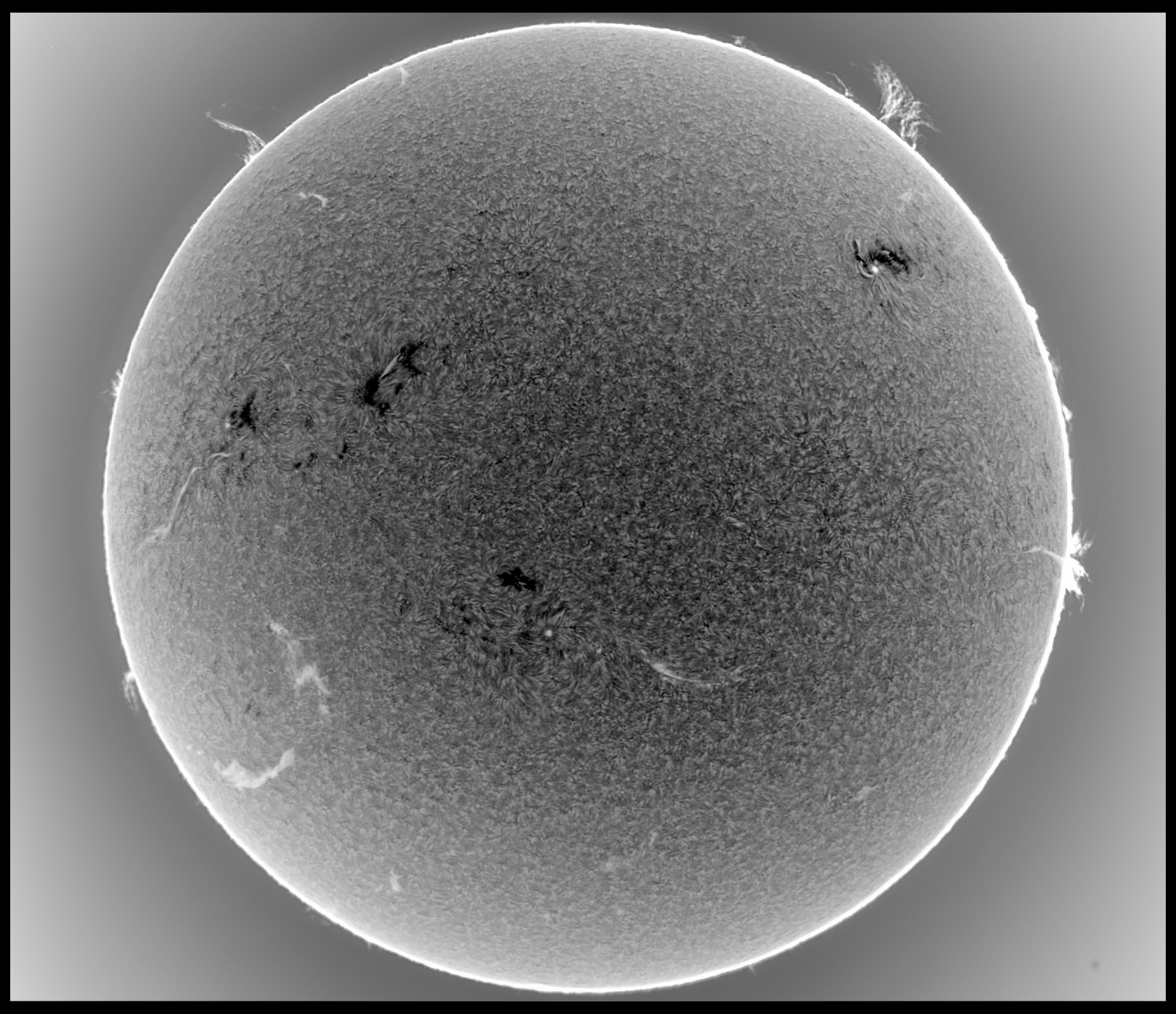 Prezint noi imagini cu Soarele de astazi in H-alpha, scanat cu SHG80mm pe la pranz, inainte sa se strice vremea. Pe discul solar, regiunea AR 4419 din emisfera nordica se dezvolta vertiginos, avand o pata solara uriasa si un grup de pete mai mici si pori, ce au o polaritate magnetica opusa fata de pata solara mare, iar in stanga petei mari se afla o zona luminoasa activa vizibila in H-alpha, suprapusa peste grupul de pete mici si pori ale regiunii AR 4419. Cealalta regiune din emisfera sudica, anume AR 4415, cu o singura pata solara de forma circulara, a ramas stabila de cand a aparut pe fata vizibila a discului solar. Pe limb, aspectul protuberantelor s-a mai schimbat, unele au disparut, altele au aparut in alte locuri de pe limb.