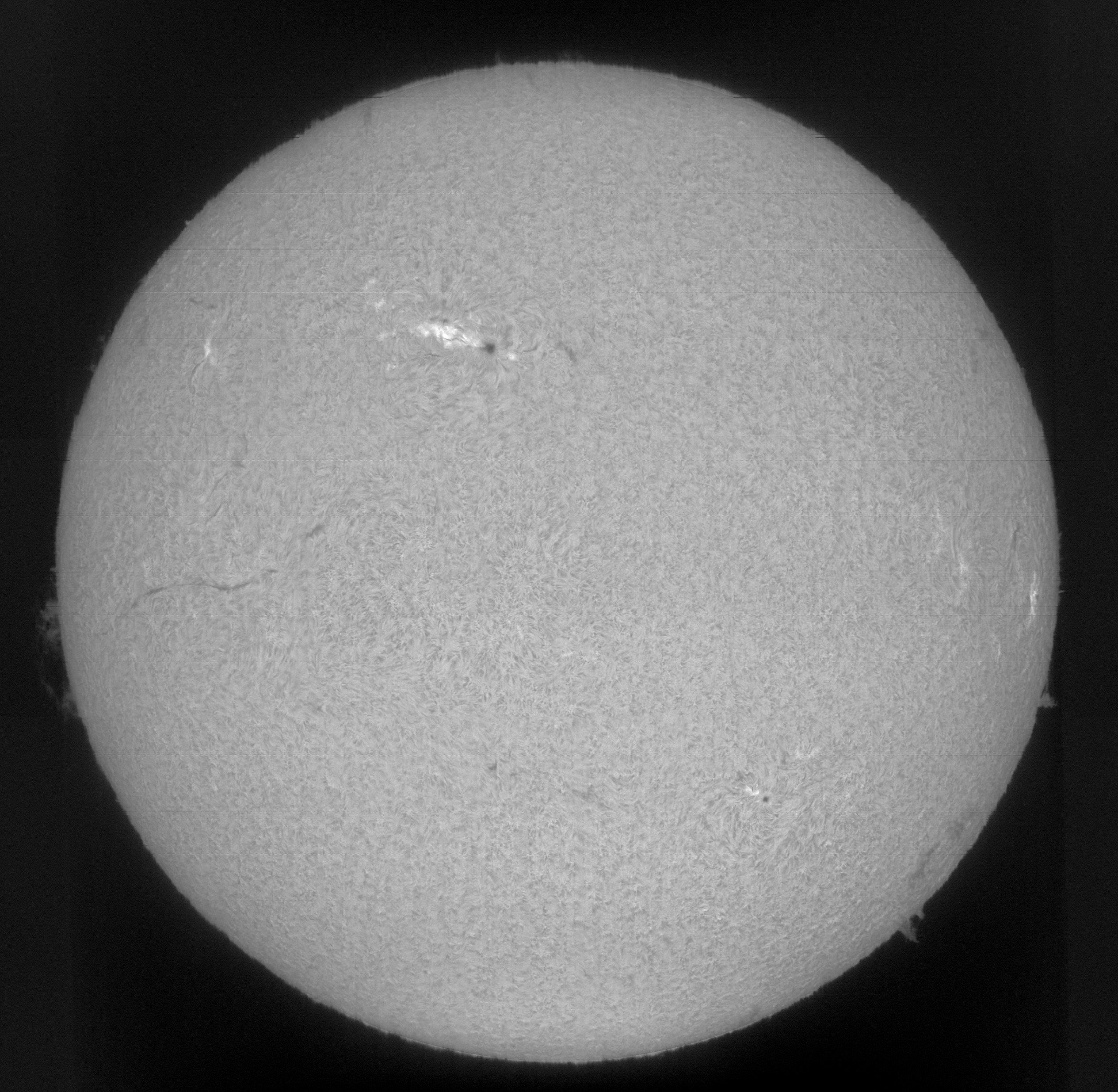 Prezint si eu cateva imagini reusite cu discul solar in H-alpha de astazi, scanat cu noul SHG de 80mm. Primele doua imagini sunt mozaicuri cu discul intreg, rezultate din cate trei imagini, prelucrate din scanari facute in mod Bin2 (zgomot mai redus), iar ultimele doua imagini sunt close-up cu regiunea AR 4419 si o protuberanta de pe limbul estic al discului solar, extrase din scanari facute in modul Bin1, pentru rezolutie mai buna.