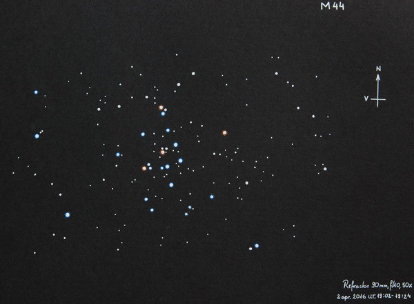 M44 - cel mai bine s-a observat roiul de stele din Cancer cu oculare ortoscopice la 36x(Fuji.25mm) si 50x(BCO18mm). S-au vazut cateva lantisoare de stele colorate alb-albastrui si oranj. Un roi deschis frumos si extins.