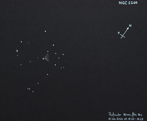 NGC2266 - un roi stelar deschis in constelatia Gemini, in apropiere de ε Gem. Este compact cu aspect nebulos-granular cu cateva stele presarate. Observat la 50x si 91x.
